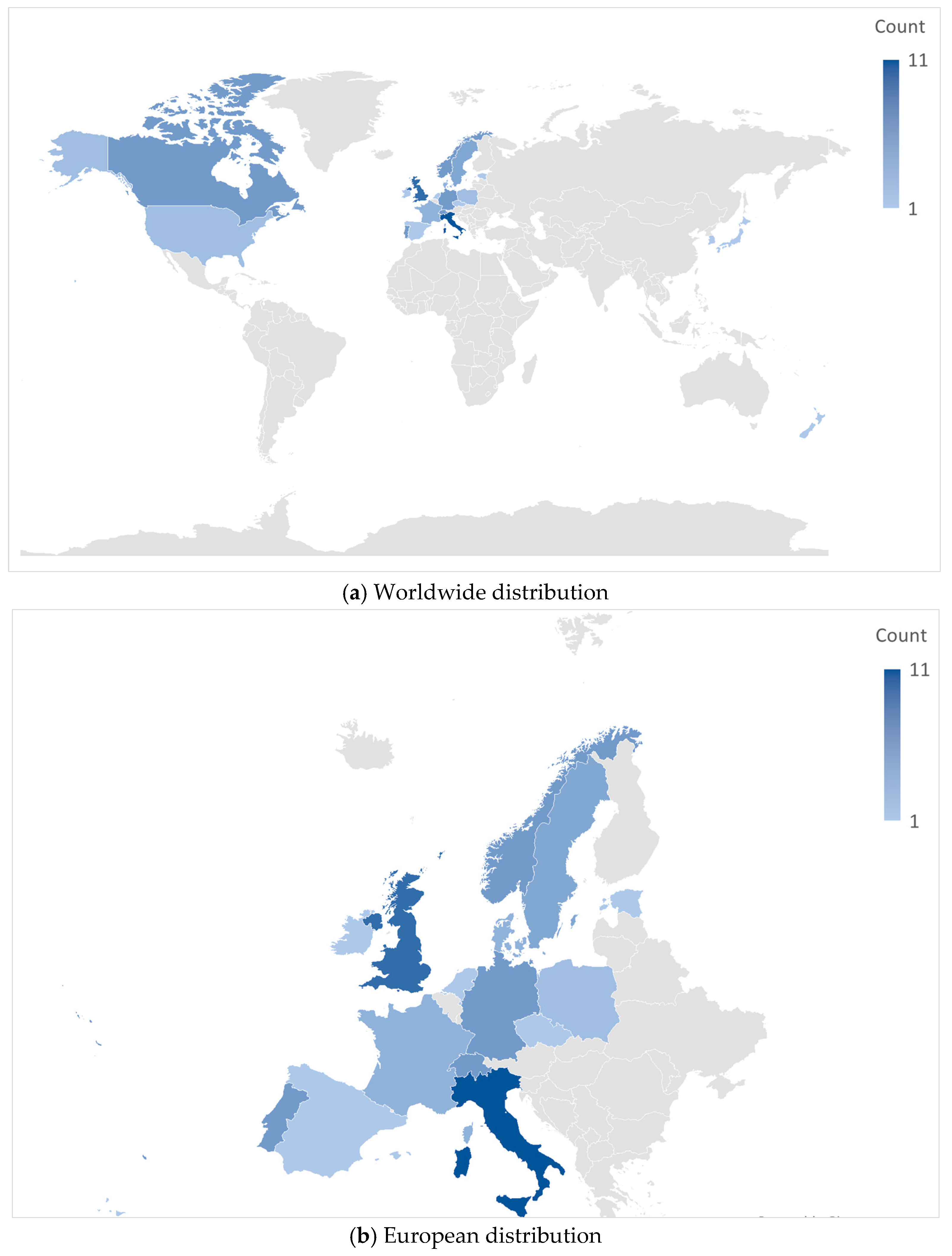 Figure 3. Frequency of the geographic distribution of study location: (a) worldwide, (b) European detail.