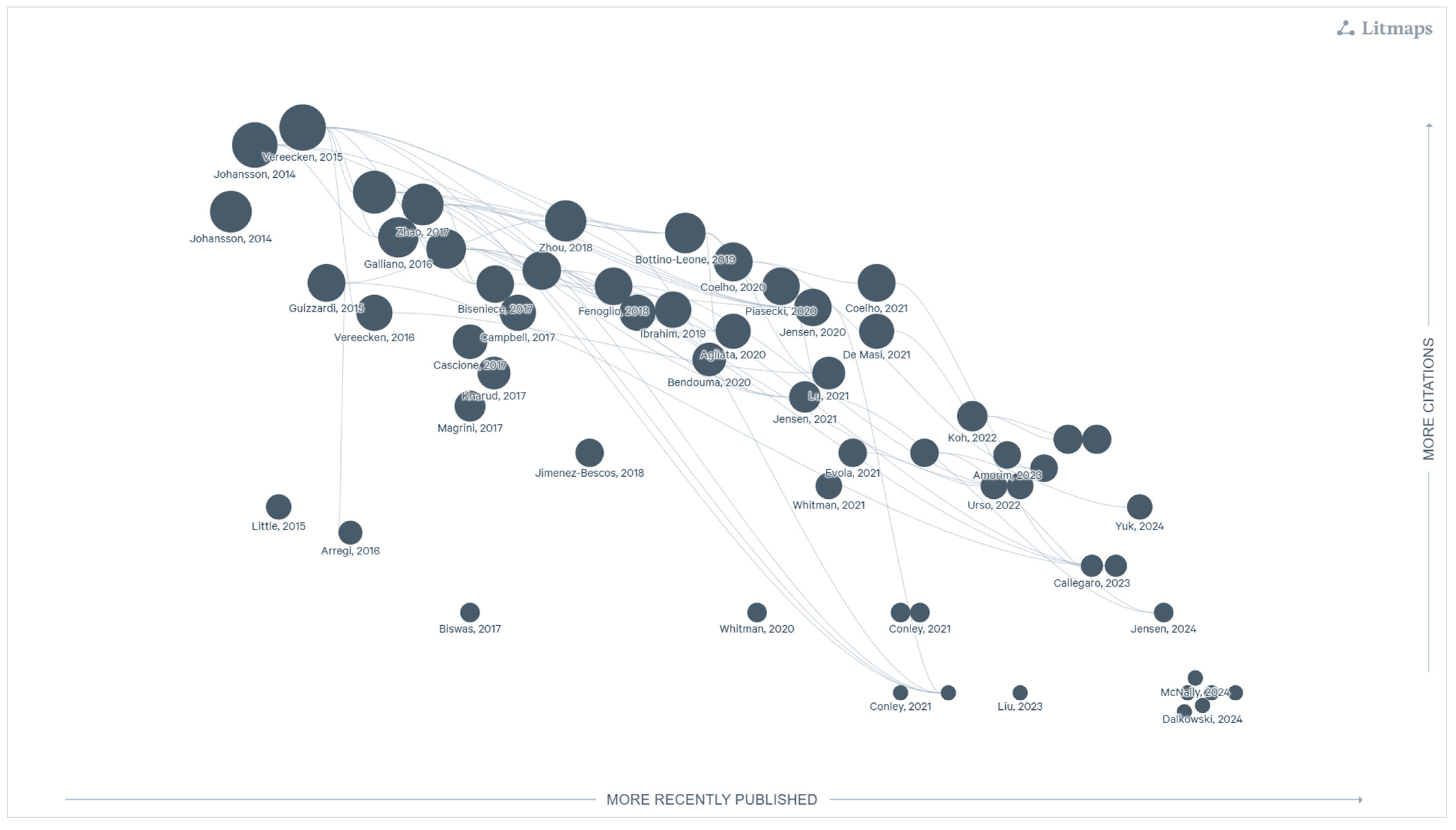 Of the 59 studies selected, there were many interconnections between groups and themes. This is seen using the literature review visualization tool, Litmaps [20], in Figure 4 below. This tool gives the citations between studies as linkages, with increasing citations of the publication as larger circles, for a given publication where first author and year published are noted.