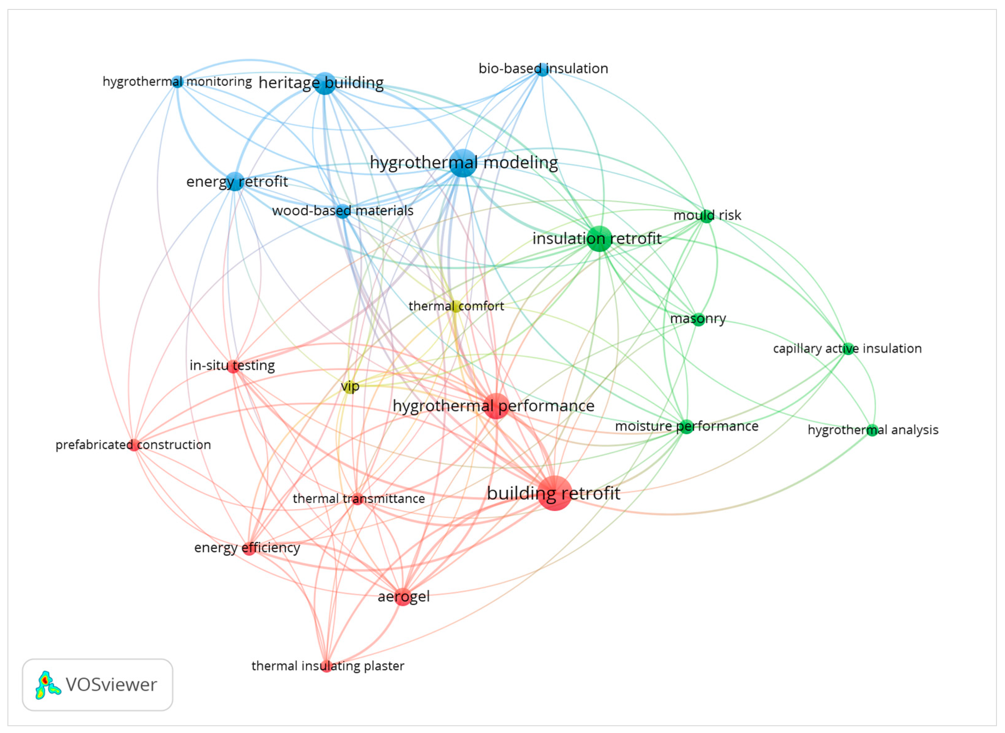 As expected from the focus of this review (hygrothermal performance of innovative materials in building retrofits), common keywords include building retrofit, insulation, hygrothermal performance, and modelling. Also, the frequency of heritage buildings and heritage retrofits can be expected for the research locations representing western Europe and the funding available for heritage retrofits [9]. The hygrothermal metrics that were most frequently mentioned beyond hygrothermal monitoring, performance, and analysis were moisture performance, which included moisture content and related terms, and mould risk. Both these categories were frequently used metrics in the reviewed publications.