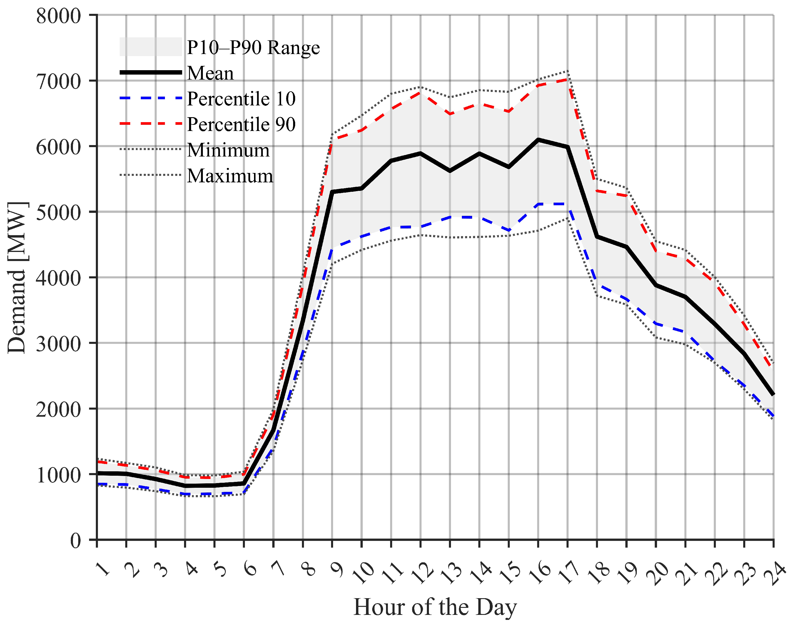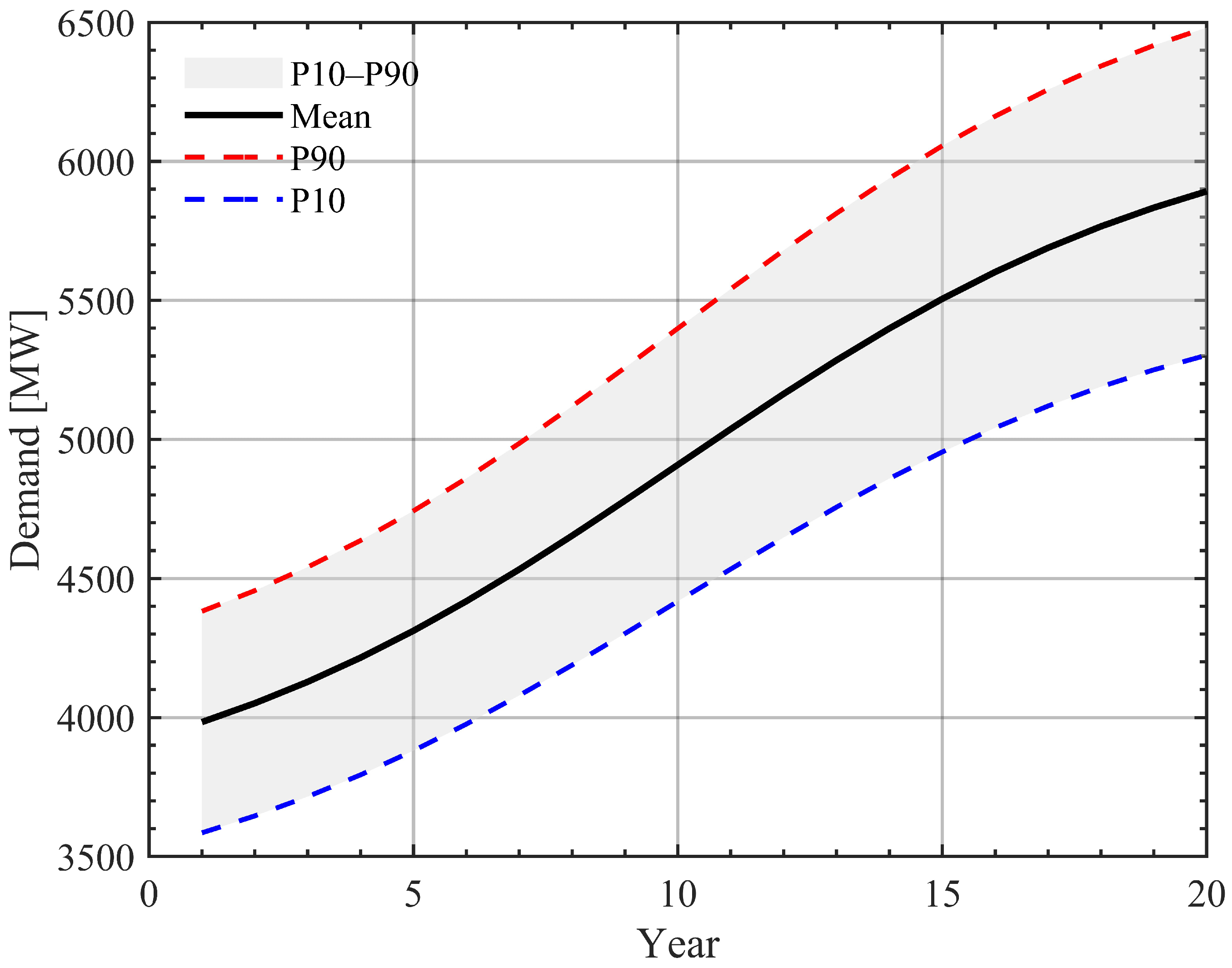 Demand growth | 0.8–1.6%/year | Scaled hourly profile with compound growth | 1.2%/year baseline |