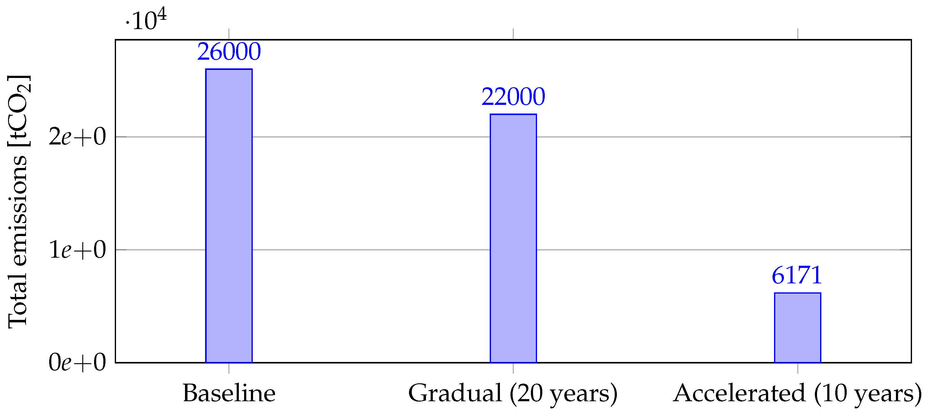 Accelerated transition (10 years) | 6,171 | 75.0 | 48,000 + 150 (emissions) |