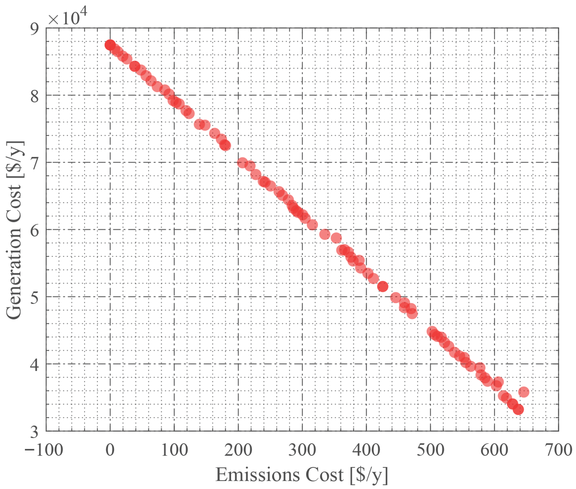 - Decision is carried out through a multi-objective trade-off among (i) generation cost (EGSC, (23)), (ii) expected cost of energy not supplied (EECC, (18)), (iii) demand response program cost (ELRC, (24)), and (iv) carbon cost (ECEC, (22)). We use the fuzzy-ranking step in Algorithm 1 to select a single actionable plan from the non-dominated set.