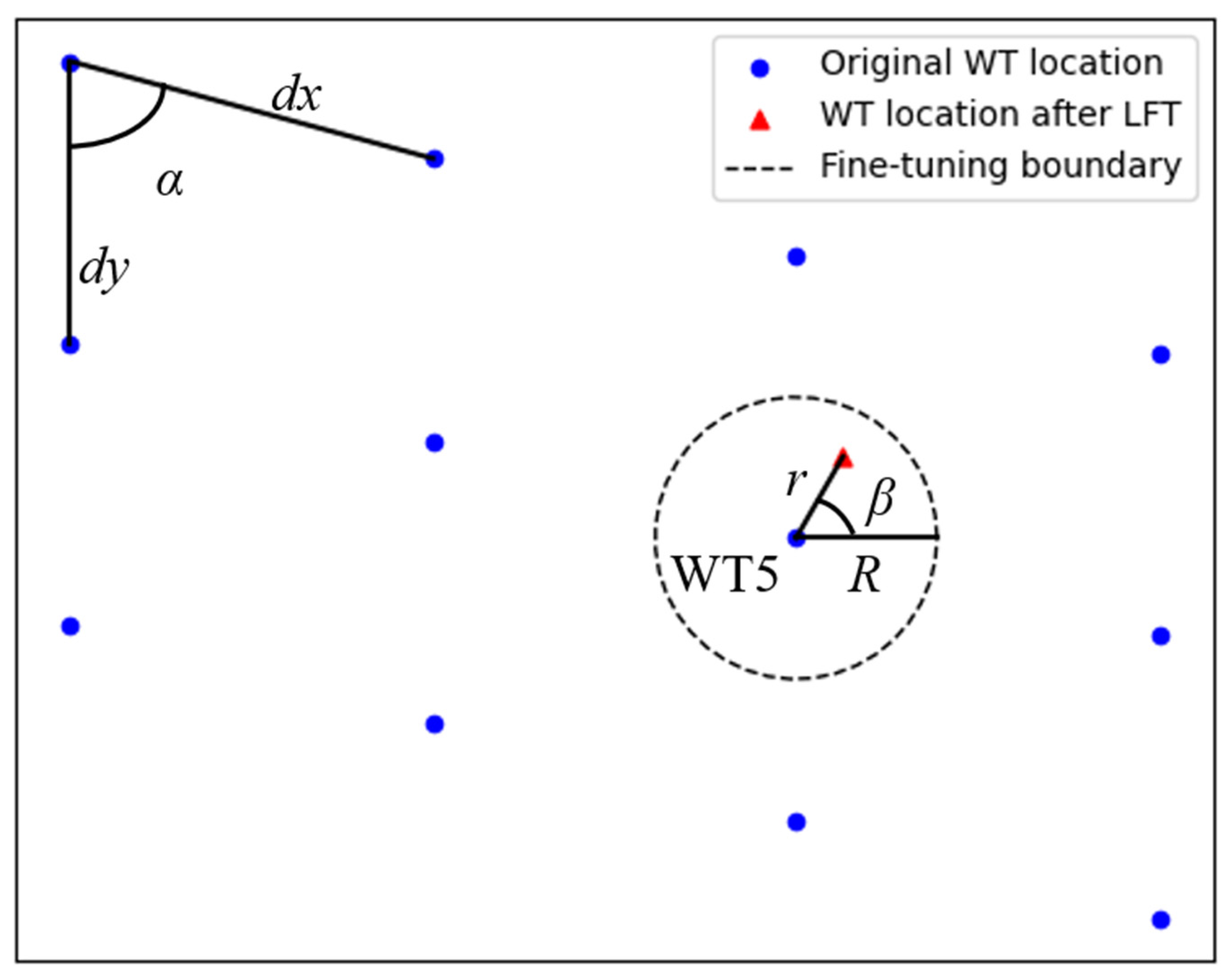 - Action: The action space encompasses the total available fine-tuning region, with each point being a potential WT location. For the fine-tuning region of k turbines, the action a = (±Δrj, ±Δβj) controls the movement of the turbines. The predefined fine-tuning circle sets the maximum displacement limit. The parameterization is defined by 8 variables (a radius step ±Δr and an angle step ±Δβ for two turbines).