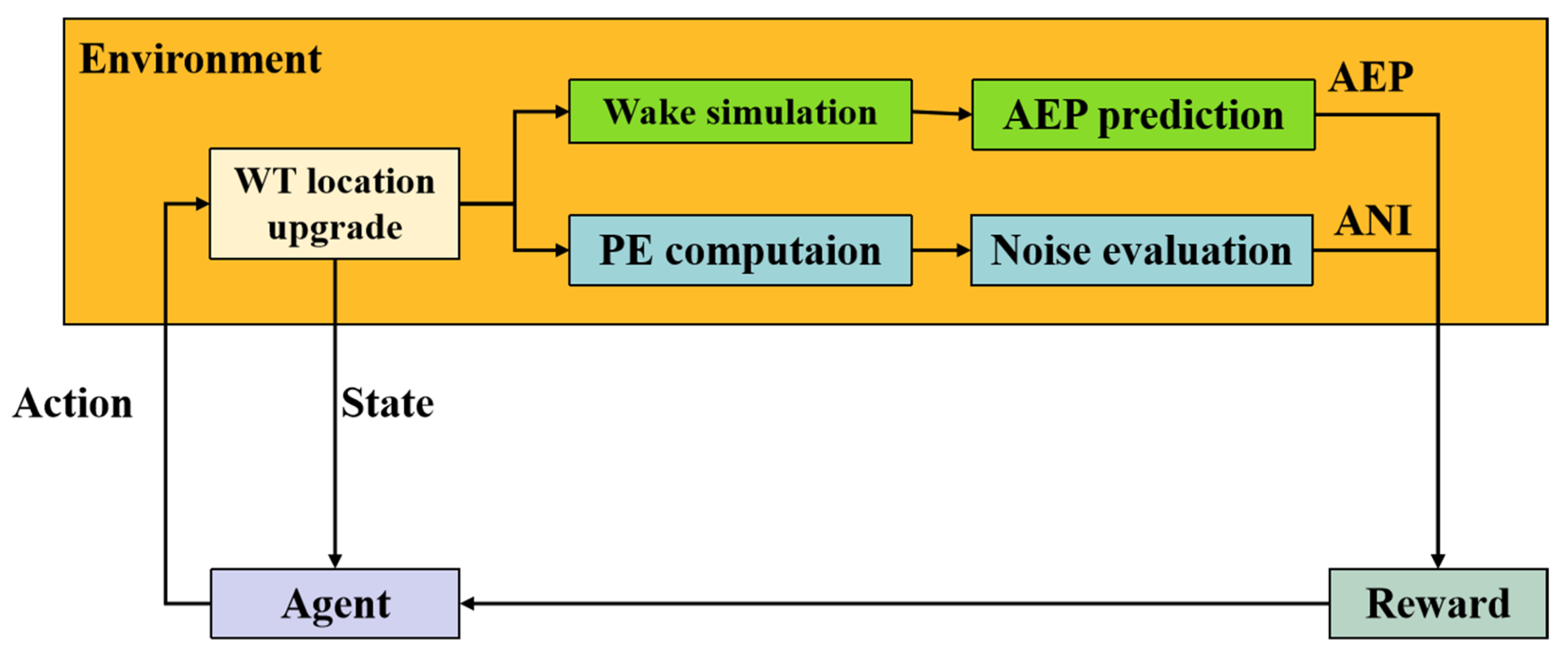 - Reward: The value of GPN of a given wind farm layout represents the reward. Based on the current state and the original layout, the entire wind farm layout (xi, yi) (i = 1, 2, …, N) is created. Wake simulations and PE computations are then conducted to obtain total AEP generation and the noise influence area. Finally, rewards are calculated by combining the AEP improvement and noise area reduction.