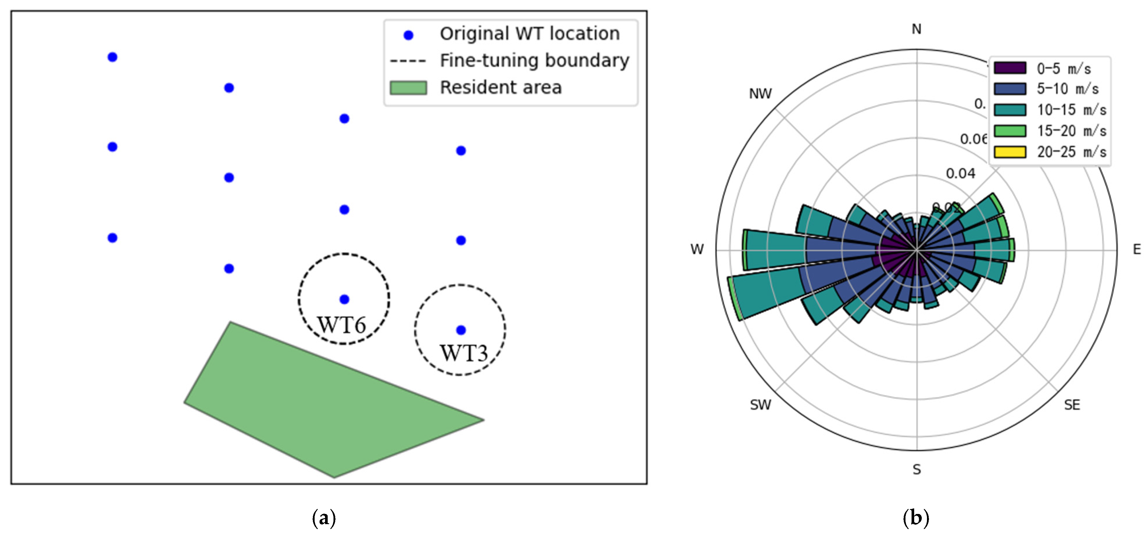 - Mittal, P.; Mitra, K. Micrositing under practical constraints addressing the energy-noise-cost trade-off. Wind Energy 2020, 23, 1905–1918. [Google Scholar] [CrossRef]