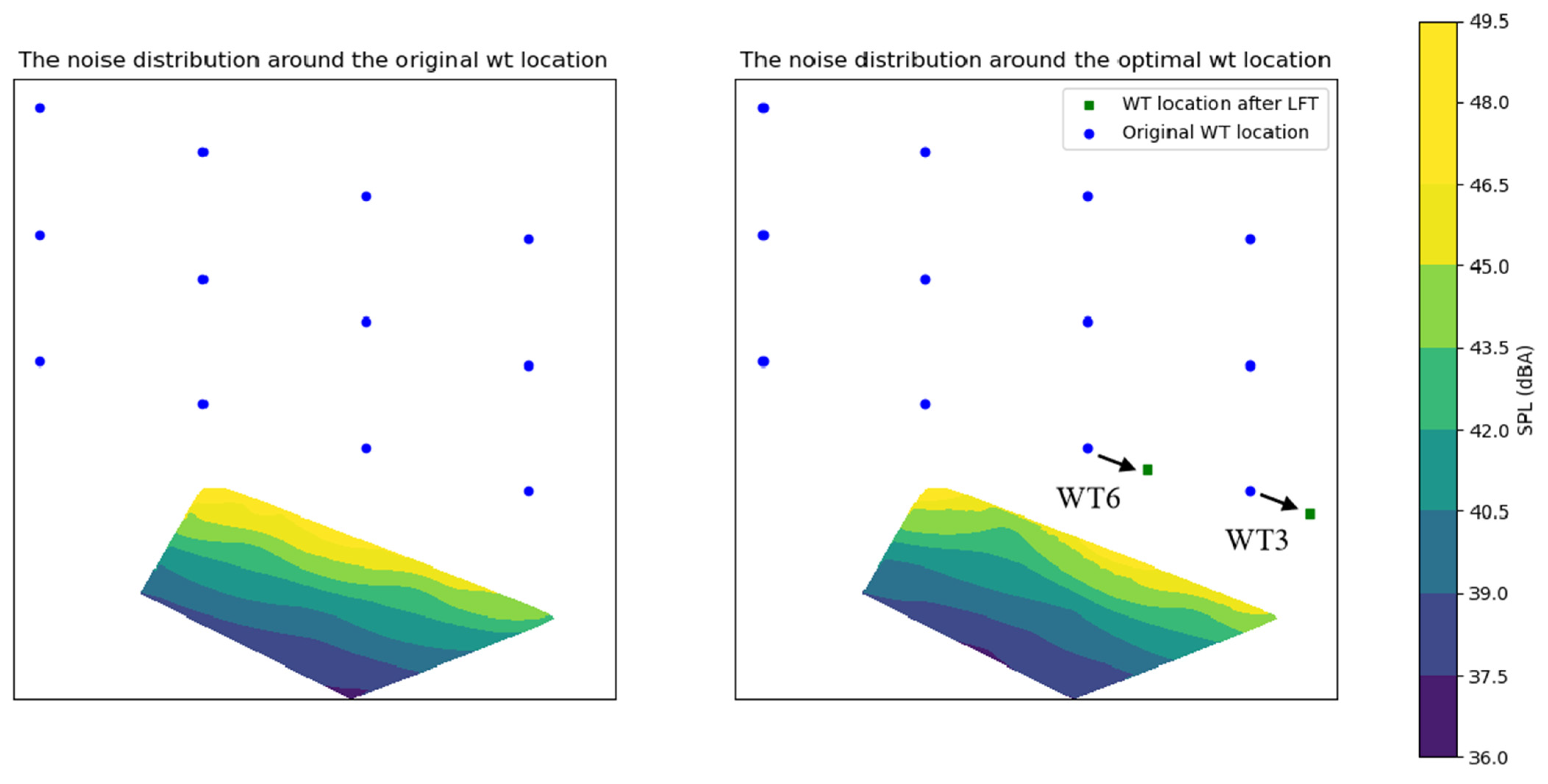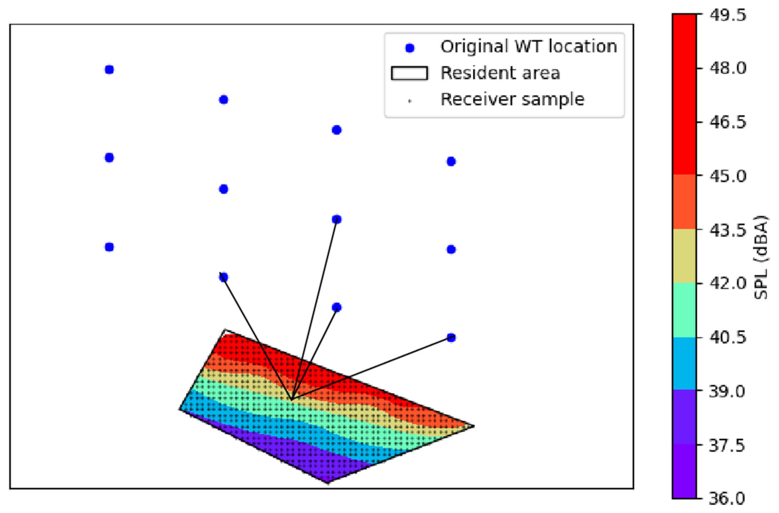 - Wu, X.; Hu, W.; Huang, Q.; Chen, C.; Jacobson, M.Z.; Chen, Z. Optimizing the Layout of Onshore Wind Farms to Minimize Noise. Appl. Energy 2020, 267, 114896. [Google Scholar] [CrossRef]