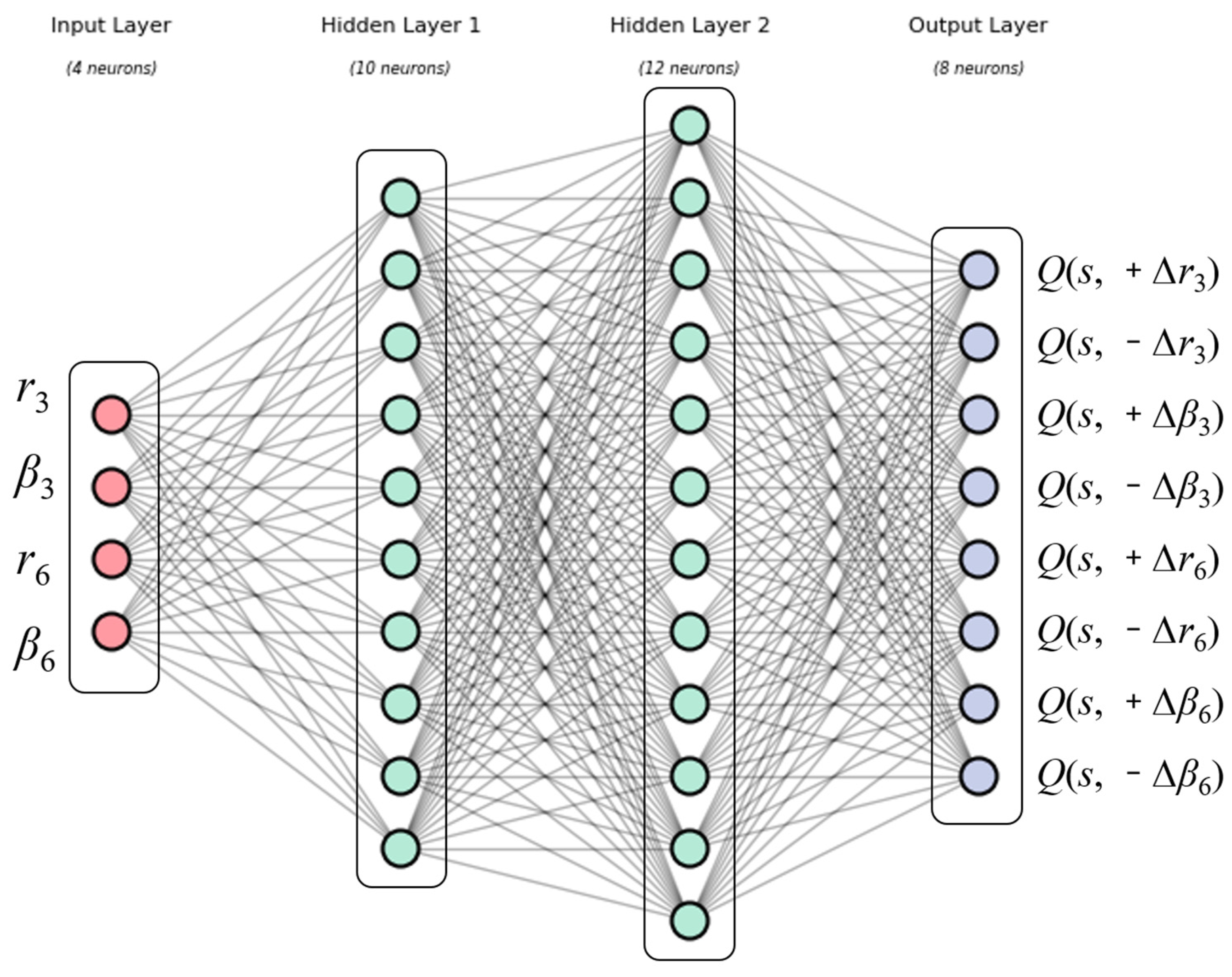 - State: The state s means the current location (rj, βj) (j = 1, 2, …, k) of k WTs under fine-tuning. The state is upgraded by a new action. To improve efficiency, the continuous region is discretized, the step intervals Δr and Δβ are set to 0.2D and 10°, respectively. These values were determined through empirical tests and calibrated against neighboring resolutions (Δr: 0.1D, 0.3D and 0.4D, Δβ: 5° and 15°). These resolution values were chosen based on an initial parameter sensitivity analysis. The guiding principle was to balance computational efficiency and result accuracy. The state is the WT location at the current step.