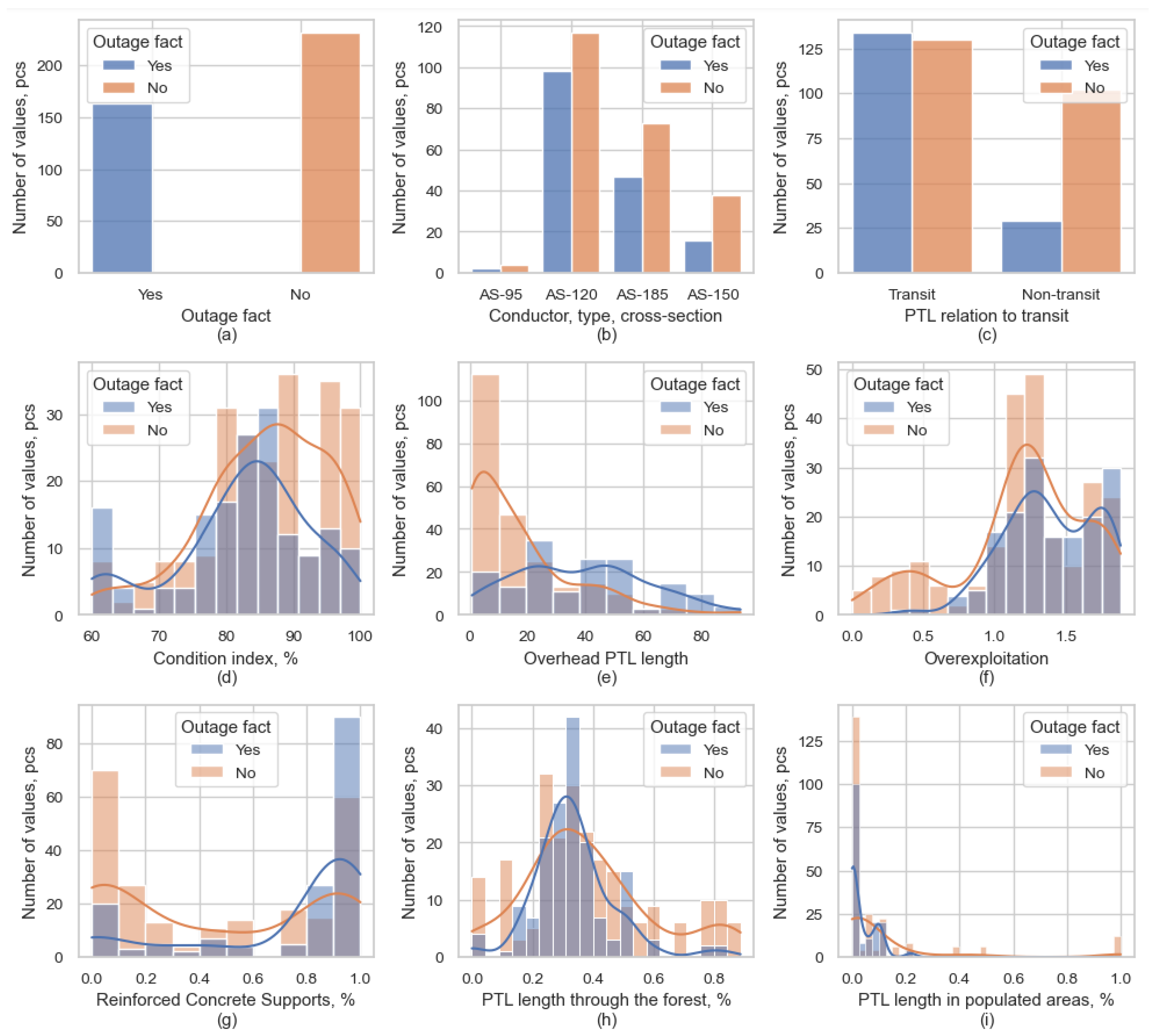 - As can be seen from the histograms of categorical features, it is clear that there is a different distribution of values for power transmission lines with and without failures, which indicates their impact on the target variable. The low cardinality of categorical features (four values for the feature “Conductor, type, section” (Figure 1b) and two for “PTL relation to transit” (Figure 1c)) must also be noted. According to this, when preparing data for the direct training of ML models, the most optimal coding of categorical variables is considered to be the One-Hot Encoding technique.