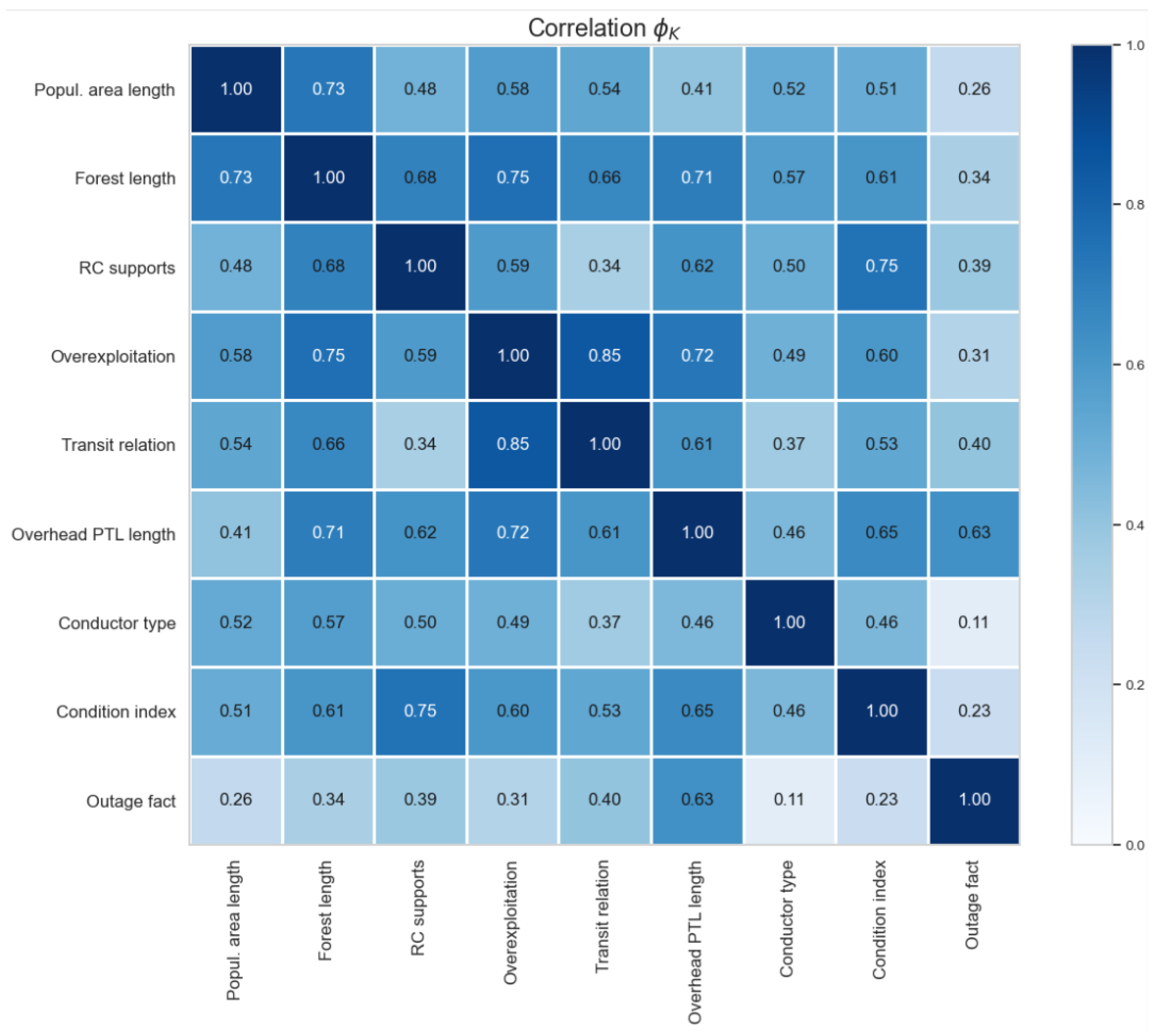 - The target attribute “Outage fact” has a not strong but sufficient correlation with the variables under consideration. The highest correlation is shown by the feature “Overhead PTL length” (0.63) and the smallest by the categorical feature “Conductor, type, section” (0.11);