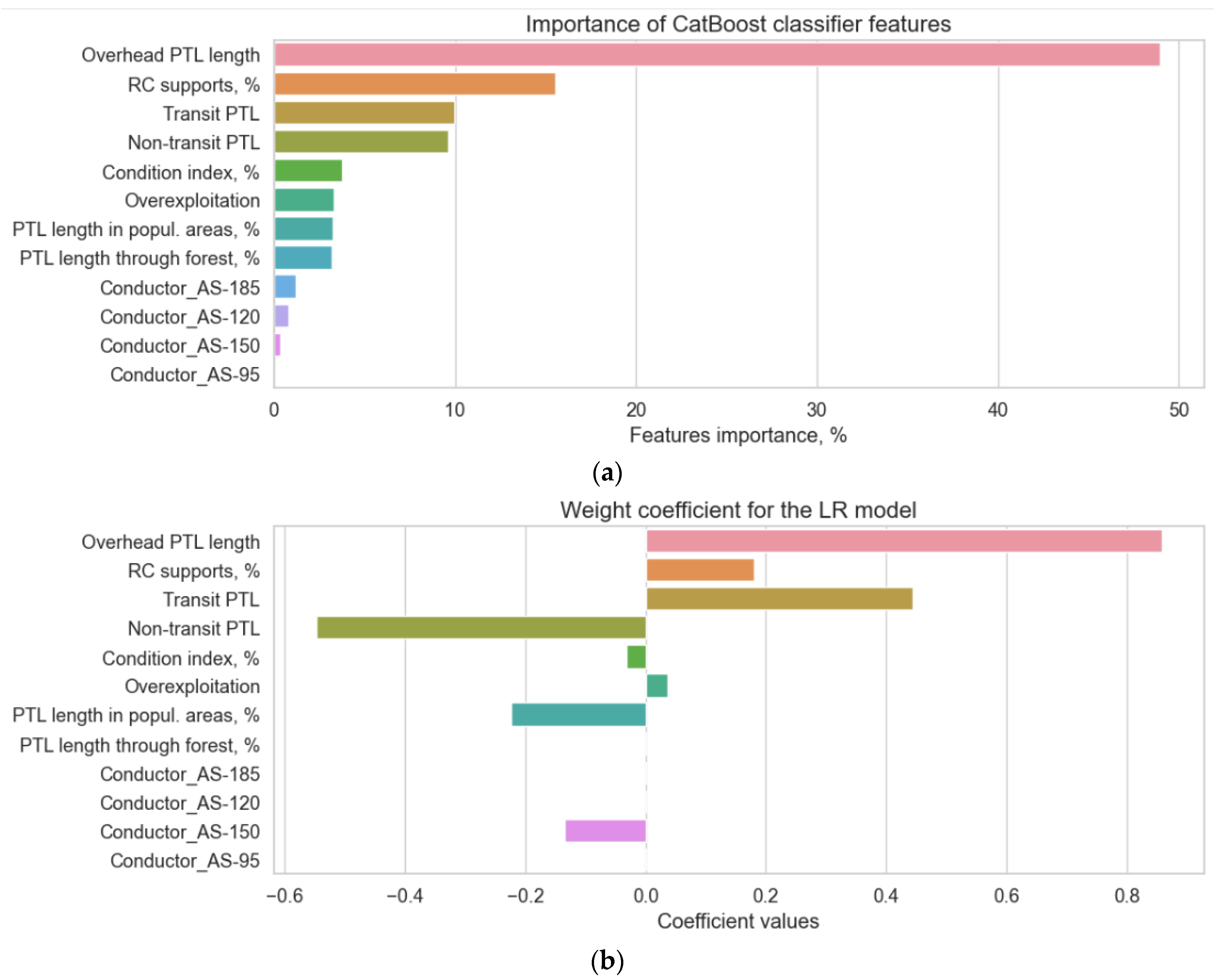 - The replacement of the absolute values of the number of reinforced concrete (RC) and metal supports, as well as the length of the forest and populated areas with relative values, made it possible to cope with the problem of the multicollaterality of these features (this problem was discussed at the previous stage of the study [35]), which should have a beneficial effect on the training of ML models;