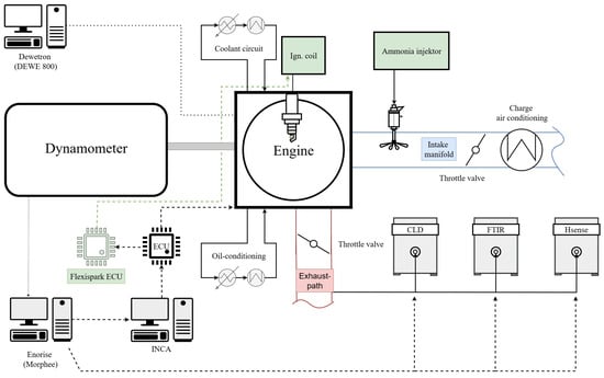 The experimental investigations are carried out on a single cylinder research engine derived from the Liebherr D966 diesel engine (for characteristics, see Section 2.1). The engine, modified as part of the Campfire Alliance project, operates with spark ignition and has been adapted for liquid NH3 fuel. To ensure precise monitoring and control, the engine was installed on a fully instrumented test bench, enabling comprehensive data acquisition with MORPHÉE (Enorise, Trappes Cedex, France) and real-time combustion analysis with with DEWE-800 (DEWETRON GmbH, Grambach, Austria). The test bench also features conditioning for cooling water, oil, and charge air. Both coolant and lubricating oil temperatures were kept at 85 °C throughout all experiments to ensure reproducibility and comparability of the operating points. Charge air heating is applied upstream of the intake manifold using an inline electric air heater to increase the intake air temperature up to 60 °C, which is crucial due to the high enthalpy of NH3 vaporization. Elevated intake temperatures facilitate faster ammonia evaporation, improve mixture homogeneity, and enhance ignition reliability, particularly at low-load conditions. A schematic overview of the setup is shown in Figure 1.