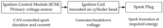 Former tests on the same single-cylinder research engine demonstrated that higher ignition energy is required to achieve stable operation with pure NH3, particularly at low loads and low in-cylinder temperatures [19,20]. Based on these findings, a capacitive ignition system (“FlexiSpark” from SEM [21]) was implemented as the ignition source. The system consists of an ignition control module (ICM), which includes the primary voltage source and a dedicated ignition coil sitting on top of the cylinder head. Via CAN-connection, the parameters “spark duration” and “spark current” can be adjusted to the user’s desire. A schematic of the ignition system configuration is shown in Figure 2. The system generates a spark with the required breakdown voltage without supplying unnecessary energy. After the breakdown it switches over to control the spark current and duration to the parameters given via CAN. This principle ensures energy-efficient and reliable spark formation, while reducing spark plug wear. The electrical specifications of the ignition system are listed in Table 3. The spark plug is the same for all measurements shown. It is a standard M14 J-Gap spark plug (Robert Bosch GmbH, Stuttgart, Germany) with an electrode spacing of 0.3 mm.