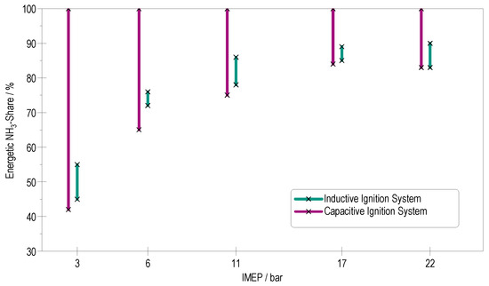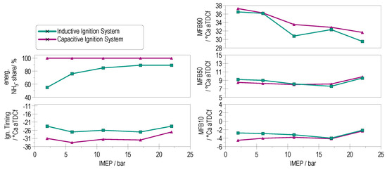 Figure 5 shows the ignition timing, the °CA position for 10%, 50%, and 90% mass fraction burnt MFB (MFB10, MFB50, MFB90), as well as the energetic NH3 share plotted against the IMEP. For all operating points, except full load, the MFB50 is kept constant at 8 °CA aTDCf to maintain stable combustion phasing. At full load, however, the high compression ratio causes peak cylinder pressures to exceed 220 bar, requiring a delayed combustion phasing to avoid excessive mechanical stress. In the case of the inductive ignition system, H2 is required to stabilize inflammation and combustion. While at constant MFB50, the combustion using the capacitive ignition system reaches MFB10 earlier, whereas the inductive ignition system reaches the end of combustion (MFB90) faster. This shows that the combustion duration of pure NH3 is 2 °CA longer (see Figure 6, bottom left). This is due to the lower laminar flame speed of pure NH3.