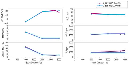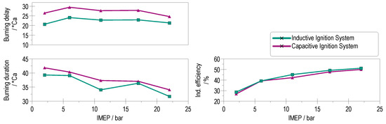 Appropriate values are typically above 75%, indicating proper ignition and combustion of the air–fuel mixture. Negative values indicate unstable combustion or misfiring [27]. With a spark duration longer than 2000 µs, a stable combustion without misfires can be achieved. A shorter spark duration increases the likelihood of misfiring.