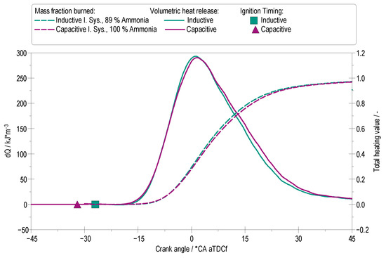 Figure 7 compares the total heating value and the volumetric heat release rate at 17 bar IMEP at maximum possible EAS for the two ignition systems. The total heating value and net heat release rate were derived from the measured in-cylinder pressure using the first law of thermodynamics, neglecting wall heat losses. Pressure data were acquired with a Kistler 6045BS3-2 sensor (Kistler Instruments AG, Winterthur, Switzerland) at 0.1 °CA. resolution and averaged over 200 consecutive cycles. A polytropic coefficient of 1.3 was assumed for compression and expansion. To reduce measurement noise, the data were smoothed using a Savitzky–Golay filter within a window of −30 to 90 °CA aTDCf. The net heat release rate was normalized to the maximum value and the cumulative heat release was calculated including the injected fuel mass and its lower heating value. The curves represent the mean values from measurement series with the lowest COVIMEP, in order to provide a consistent basis for evaluating combustion duration. The lowest COVIMEP value for the capacitive ignition system is 1.9% and the lowest value for the inductive ignition system is 2.0%. The results show that the combustion duration achieved with the capacitive ignition system is similar to that of the inductive ignition system, despite the fact that the latter requires an H2 admixture to initiate stable combustion. While the early combustion phase in the inductive system appears slightly faster (0.5 °CA) due to hydrogen’s higher reactivity, the overall heat release process closely aligns with that of the capacitive ignition system operating on 100% NH3. This shows that, under optimized ignition conditions, pure NH3 can achieve similar combustion characteristics without the need for carbon- or H2-based ignition assist.