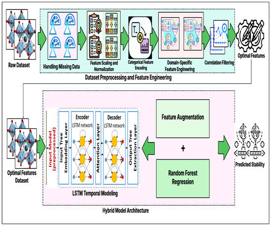 The use of ensemble averaging in Random Forests effectively reduces variance and improves the model’s ability to generalize to unseen data. This property is especially valuable in the context of perovskite stability prediction, where the underlying relationships between compositional features and stability outcomes are highly complex and nonlinear. A schematic representation of the proposed hybrid model pipeline is provided in Figure 1, illustrating the sequential processing steps starting from feature selection, followed by temporal embedding extraction through LSTM and culminating in ensemble regression via Random Forest.