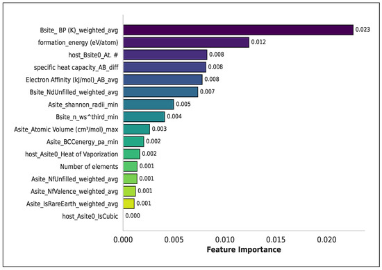 Feature importance ranking obtained through Genetic Algorithm-based optimal feature selection from the original 81 features. The most influential features include the weighted average bond parameter at the B-site (Bsite_BP(K)), formation energy, and host B-site atomic number (host_Bsite0_At.#). Several features share identical importance values (e.g., 0.001), reflecting comparable contributions to the predictive model.