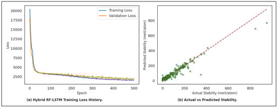 Hybrid LSTM–RF model performance: (Left) training and validation loss history; (Right) actual vs. predicted thermodynamic stability.