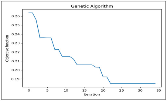To enhance the predictive capability of the hybrid model, a genetic algorithm (GA) was employed for optimal feature selection. The objective function was designed to minimize the model error while maximizing generalization, thereby identifying the most informative subset of features out of the original 81. Figure 4 illustrates the convergence behavior of the GA across successive iterations. As shown in Figure 4, the objective function value decreases steadily with increasing iterations, demonstrating the GA’s ability to progressively refine the feature subset. Initially, the error is relatively high due to redundant and less relevant features. However, after approximately the 10th iteration, a noticeable reduction in the objective function occurs, indicating the removal of non-informative variables. The curve flattens beyond the 20th iteration, signifying convergence towards an optimal subset of features. Through this process, the GA successfully selected a reduced set of features that retained high predictive power while discarding irrelevant attributes. Ultimately, from the initial 81 features, the GA identified the top-ranked subset, which was subsequently utilized for model training. This not only improved computational efficiency but also enhanced model interpretability by focusing on the most influential predictors.