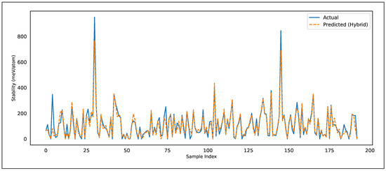 In addition to these quantitative measures, graphical analyses such as the scatter plot comparing actual and predicted stability values (Figure 3) and residual error distributions were utilized to qualitatively assess model robustness and identify any systematic deviations. These evaluation methods collectively ensure a rigorous and multifaceted validation of the proposed hybrid model’s predictive performance and generalization capability.