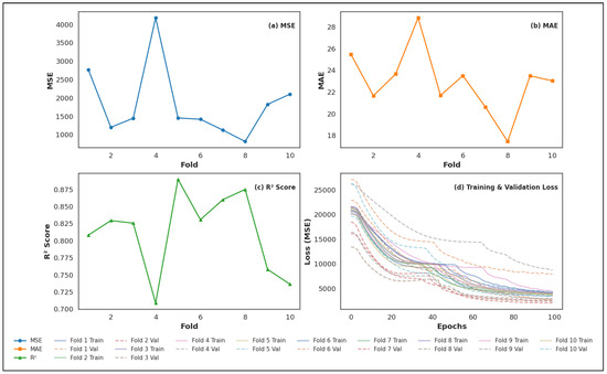 It is important to note that the score obtained from the 10-fold validation is slightly higher than the achieved under static train–test splitting ( on the independent test set). However, both the MSE and MAE from the static split (, ) are lower than those observed in the K-fold setup. This contrast suggests that while cross-validation confirms the model’s generalizability and stability, the static split provides comparatively lower prediction errors, making it more suitable for highlighting the model’s practical effectiveness in this study. To provide deeper insights, Figure 6 illustrates the fold-wise variations in performance metrics. Subplots (a)–(c) show the distribution of MSE, MAE, and values across individual folds, confirming the stability of the results despite some fluctuations. Subplot (d) presents the training and validation loss curves for all folds, which demonstrate smooth convergence behavior without evidence of severe overfitting, further validating the reliability of the proposed approach.