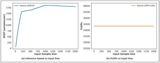 Computational efficiency of the proposed hybrid LSTM–RF model: (a) Inference speed vs. input sample size, (b) FLOPs vs. input sample size.