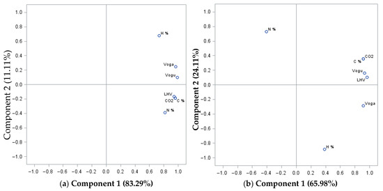 In order to identify the relationships between the individual quality parameters of biomass from the temperate and subtropical climate zones of hazelnuts, a principal component analysis (PCA) was performed. The analysis took into account both physicochemical parameters (C%, H%, N%, O%) and calorific values (LHV), as well as emission factors (CO(2)) and volume parameters of exhaust gases (Vo(ga), Vo(gu)). The use of such a set of variables allows for a comprehensive assessment of the tested raw material, taking into account both its energy potential and its impact on the environment (Figure 1a,b).