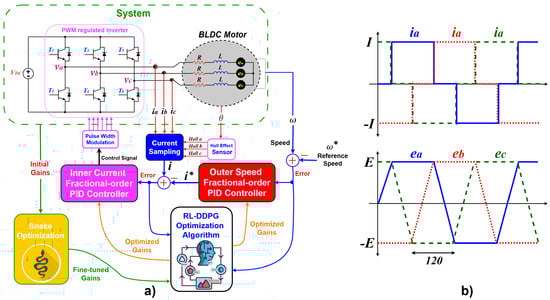 The growing implementation of Brushless DC (BLDC) motors in electric vehicles (EVs) is predetermined by higher performance in efficiency, torque-speed characteristics, and reliability [,]. They have a compact structure and brushless design, which provides lower maintenance and increased power density, which makes them suitable in space-limited, high-performance applications like EVs. Although the above advantages are present, BLDC motors are highly nonlinear, their parameters are uncertain, and their dynamic behavior varies, particularly when subjected to varying load and supply conditions []. Moreover, the BLDC motors are generally driven by a three phase inverter that brings in another level of control complexity since a high speed switching and synchronization is required. Such improper or inaccurate control of the inverter switches may result in higher switching losses, electromagnetic interference, and thermal stress- making real-time implementation more complex, and decreasing the efficiency of the overall system []. These properties present significant difficulties to traditional control systems and require the creation of superior control tactics that are able to guarantee robust, accurate and flexible operation.