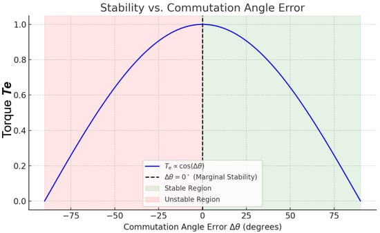 Further to explain the stability implication of commutation angle error, Figure 2 shows a graphical representation of the torque behavior with respect to . As indicated, the maximum torque is obtained when , which is marginal stability. When the system is stable as the torques are aligned positively, and when the system is unstable because the torques are aligned negatively, or reduced in magnitude. This visualization helps the theoretical classification of dynamic behavior in the open-loop operation of BLDC motors.