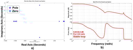 Figure 5 shows the performance and stability analysis of closed-loop system with the designed cascade FOPID controllers. As shown in the pole-zero map in Figure 5a, the system is stable since all the poles are in the left half of the complex plane indicating a good damping. The zero distribution complements the poles and this helps in improving the transient performance. Further confirmation of the system stability and robustness is through the Bode diagram in Figure 5b where the gain margin (G.M.) is 56.6 dB and phase crossover frequency is 1.02 rad/s. These measures show that it has adequate margins to be stable even in the presence of perturbations or uncertainty in the system. The high frequencies are attenuated smoothly in the magnitude plot indicating good noise rejection and the phase plot verifies that the closed-loop dynamics have suitable phase characteristics. Collectively, the analyses confirm the robustness and efficiency of the closed-loop system that is attained using the cascade control structure.