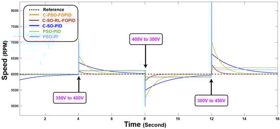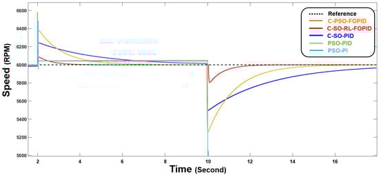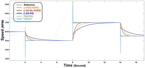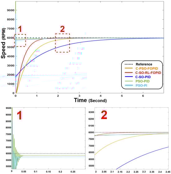 To control the system’s output speed, the suggested resilient cascade SO-RL-FOPID architecture is put into practice and evaluated using MATLAB/Simulink (2024a). The performance of the controllers at different settings is illustrated in this section through numerical simulations. At a goal speed of 6000 revolutions per minute (RPM) and a supply voltage of 350V, we assess the controllers’ tracking capability. In this instance, the controllers’ tracking performance is displayed in Figure 6.