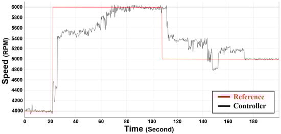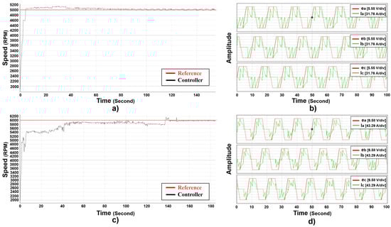 Firstly, to examine the performance of the proposed controller in the real time environment, the references of 5000 RPM and 6000 RPM are tracked by the controllers with no disturbances (Figure 12) with 350 V supply voltage. In addition, to better understand the impact of current on all phases and the level of back EMF for each phase, these components are shown for the proposed C-SO-RL-FOPID controller’s output.