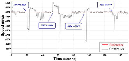 Another scenario that could demonstrate the robustness of this method is the modification of the supply voltage level. In the next case, the impact of supply voltage variation has been tested to ensure the stability of the system against this scenario. Figure 14 shows the performance of the controller in handle this disturbance under various levels.