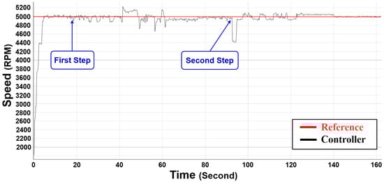 The Figure 15 shows the real-time simulation outcomes of the BLDC motor with the proposed C-SO-RL-FOPID controller with two different parametric changes. The two marked steps, First Step and Second Step, are the instances where internal resistance and inductance variation were added to evaluate the capacity of the controller to regulate the speed. The controller is able to follow the reference speed with robustness and stability even in the face of the disturbances added.