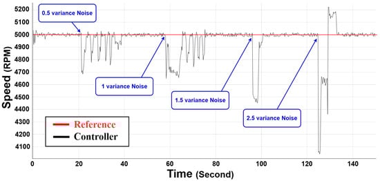 In practice, the EV motor control systems are usually susceptible to all kinds of disturbances and noise, either due to the environment, electromagnetic interference, or sensor errors. The robustness of the controller when subjected to these noisy conditions is important to be able to obtain stable and reliable performance in practice. This case study examines the behaviour of the suggested C-SO-RL-FOPID controller in the presence of sudden noise disturbances. Figure 16 shows the strength of the suggested controller in noisy environment.