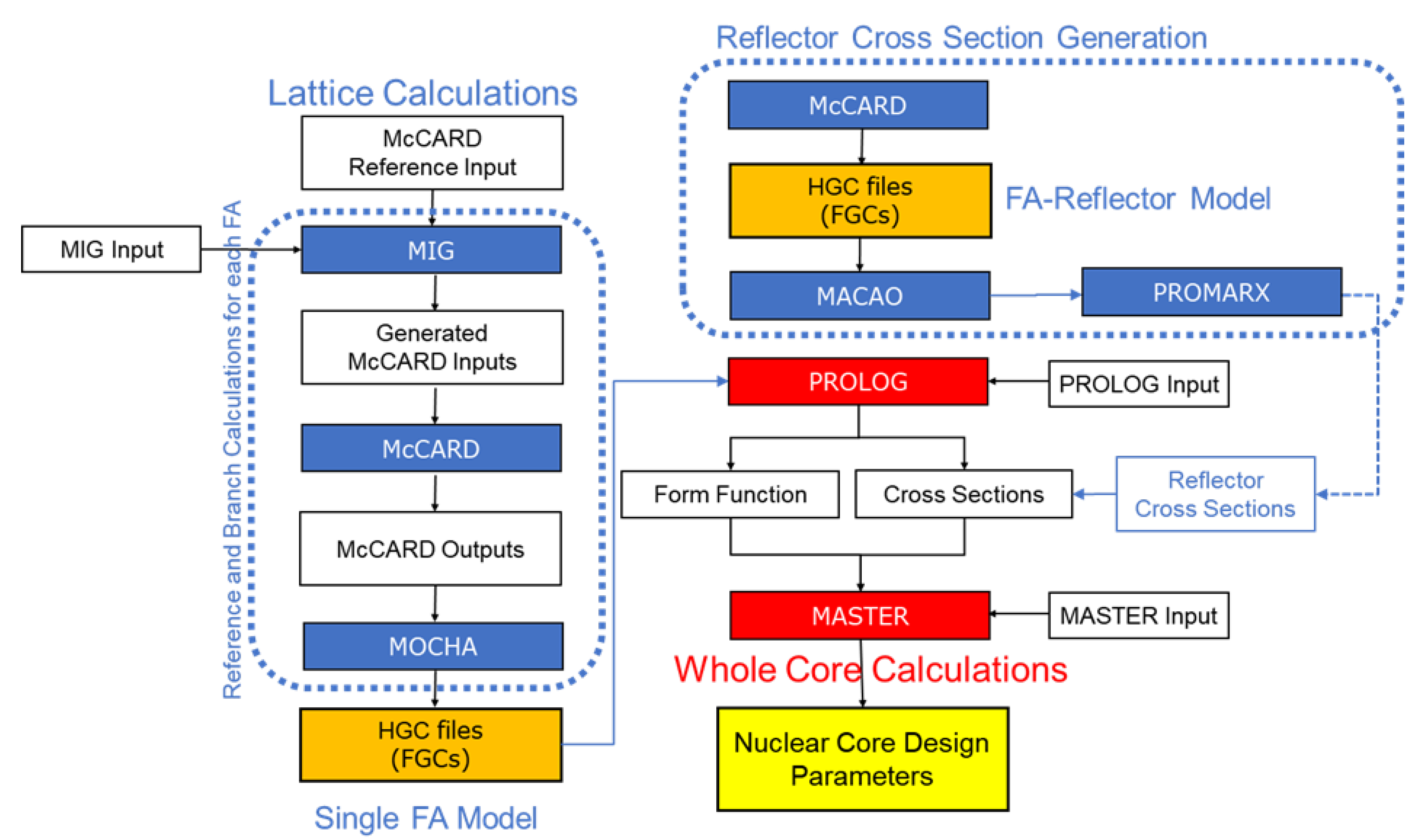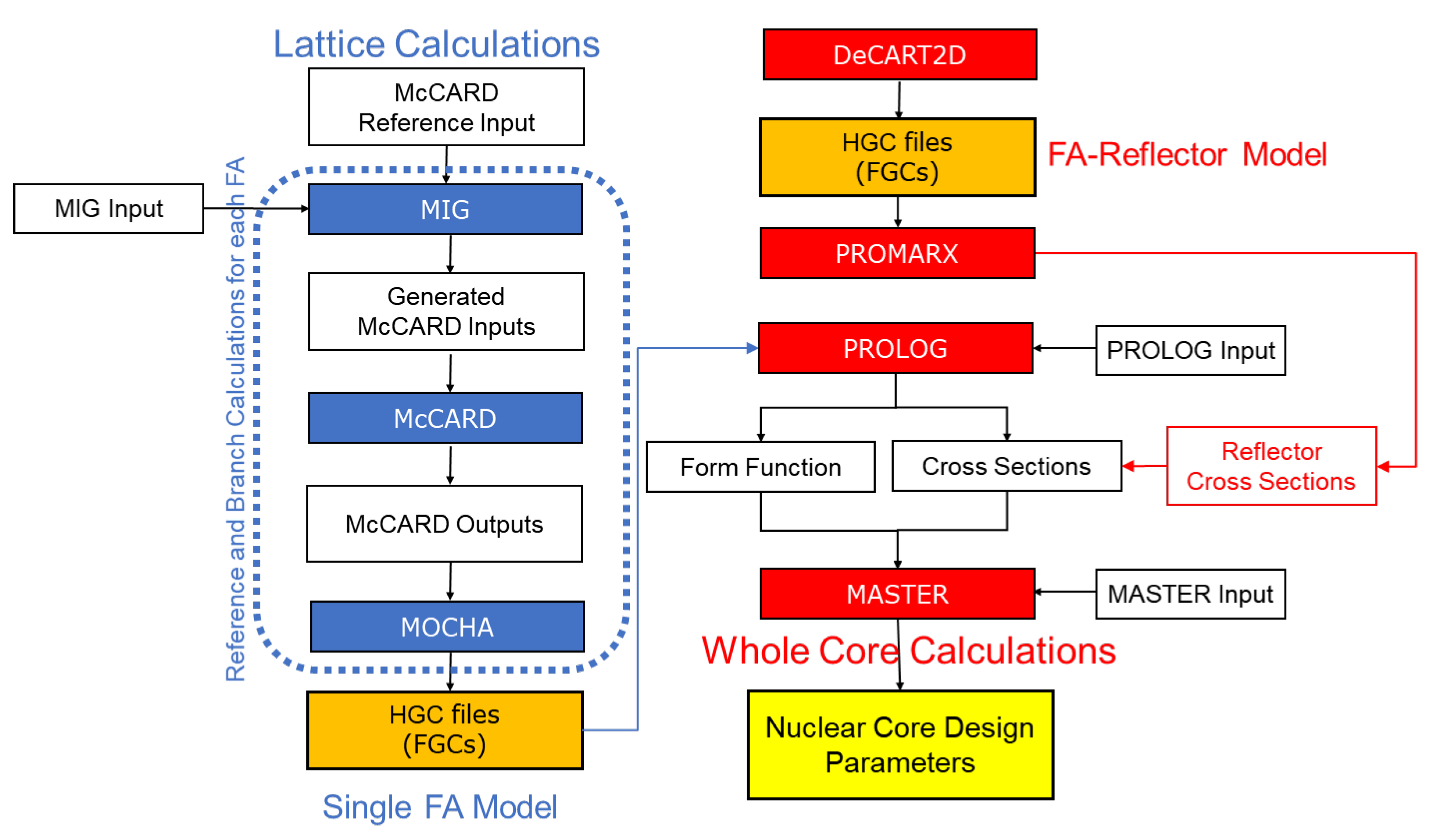 where the subscript ‘0’ denotes the reference condition. For FGC generation, reference calculations are initially performed under reference conditions, followed by branch calculations under various conditions of each parameter at selected burnup points. The resulting FGC values obtained for the reference and each branch condition are then organized and stored in a tabulated format. In McCARD, the MC tallies (i.e., microscopic and macroscopic cross-sections, flux, current, and power distributions) can be easily calculated using the track-length estimation method. The MIG code automatically generates McCARD input files for the reference and branch calculations, and the MOCHA code converts and formats the FGCs generated from MC tallies into HGC-format files that can be read by the whole-core nodal analysis code (i.e., MASTER). This overall process follows the conventional two-step procedure used in deterministic code systems such as DeCART2D/MASTER, but the main difference is that the MC method is used in the lattice calculation, allowing for highly accurate group constants without homogenization and group condensation approximation. However, while it is necessary to generate reflector cross-sections for axial and radial reflector regions for whole-core analyses, the previous McCARD/MASTER two-step code system is not equipped with reflector cross-section generation code or procedures. Consequently, reflector cross-sections produced by the conventional deterministic-based DeCART2D/MASTER code system are used without modification.