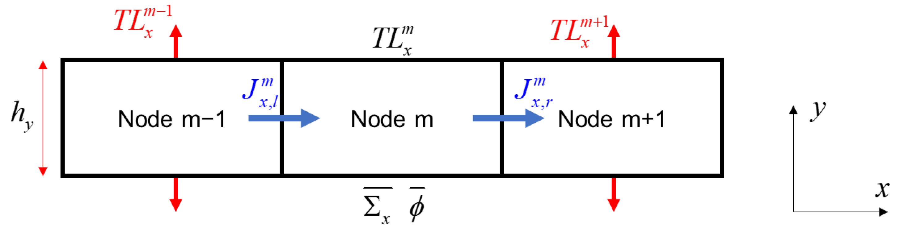 where hy is the y-axis width of node m. In general, a one-dimensional (1D) diffusion equation for a rectangular node can be expressed as follows: