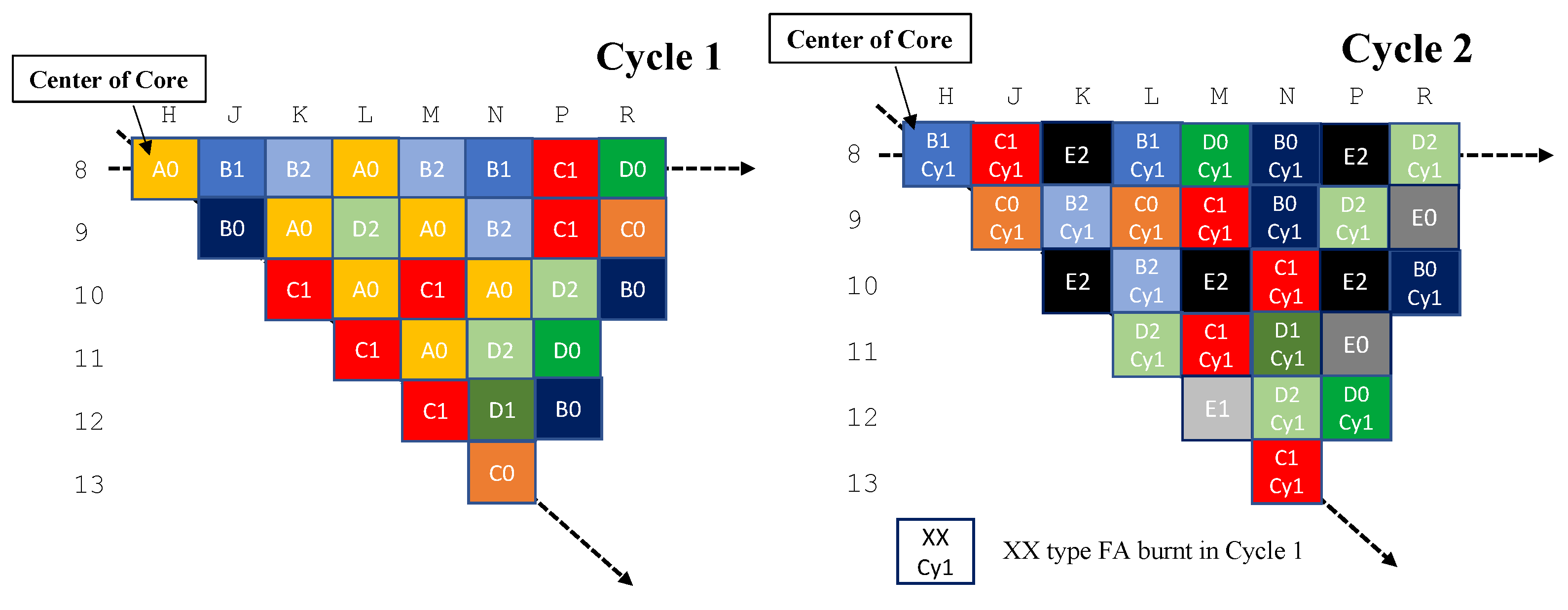 Hanbit Unit 3 is a commercial nuclear reactor of the OPR-1000 type located in the Republic of Korea. It has a thermal power of 3415 MWth, allowing it to generate 1000 MWe of electricity, and 177 FAs are loaded for each cycle. In this reactor, 16 × 16 Combustion Engineering (CE)-type FAs are loaded with 236 fuel rods with an active length of 381 cm, consisting of one instrument thimble and four control rod guide tubes. In this study, McCARD/MASTER two-step calculations for Hanbit Unit 3 were performed from cycle 1 to cycle 2; Figure 4 shows the corresponding FA loading pattern. In cycle 1, nine types of FAs (A0 through D2) are loaded. In cycle 2, all the FAs that were loaded in cycle 1 are reloaded, except A0, and three fresh FAs (i.e., E0, E1, and E2) are inserted into the core.
