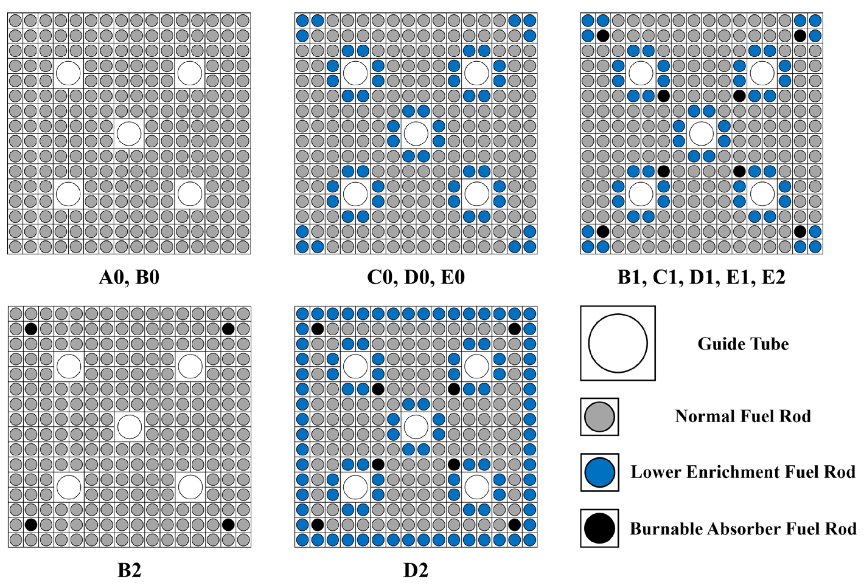 To perform whole-core analyses of cycles 1 and 2, FGCs must be prepared for all 12 types of FAs loaded over the two cycles. Meanwhile, it is important to note that burnable poison (BP) rods containing Gd2O3 and natural uranium have an axial cutback region in which BP is substituted with an alternative structural material. Accordingly, in the case of FAs with BP rods, it is necessary to generate two sets of FGCs: one for the axial region containing BP and another for the cutback region. In the case of Hanbit Unit 3, a total of 19 sets of FGCs must be generated using McCARD for whole-core analyses of cycles 1 and 2. Figure 5 and Table 1 show the specifications of the FAs loaded during the two cycles, while Figure 6 presents the axial cross-sections of the BP rods.