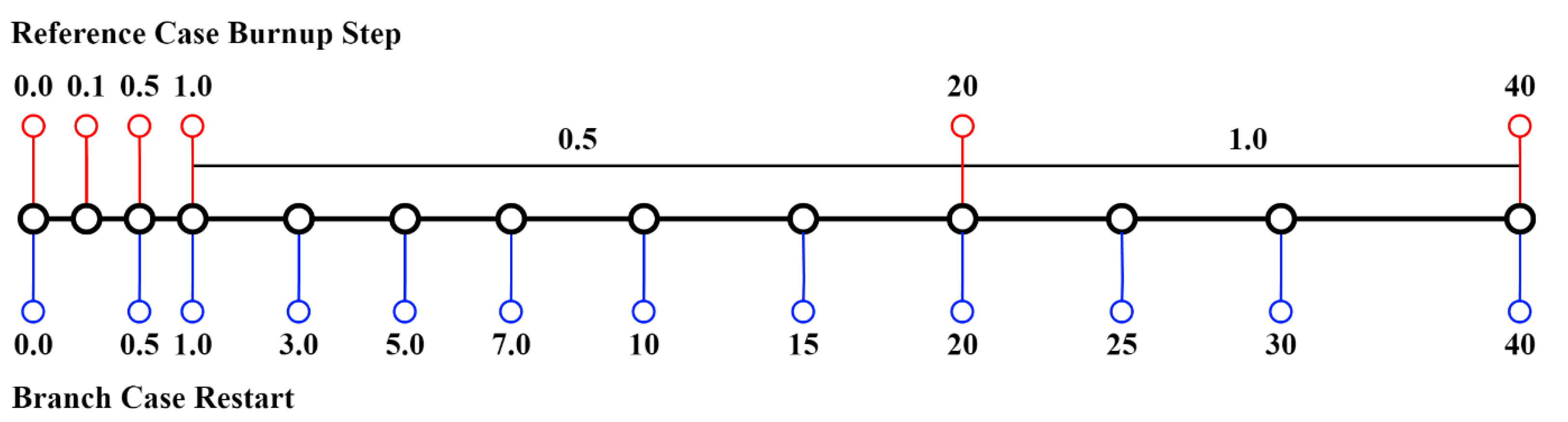 To conduct Hanbit Unit 3 whole-core analyses using the McCARD/MASTER two-step code system, FGCs and reflector cross-sections were generated. Table 2 shows the reactor operating conditions for the reference and branch calculations for FGC tabulation. For the reference calculations, the soluble boron concentration (CSB) and the fuel and moderator temperatures (Tf and Tm) were set to 500 ppm, 900 K, and 585 K, respectively. For the branch calculations, variation conditions of 700 K for the fuel temperature and 1000 ppm for the critical boron concentration (CBC) were applied, while the moderator temperature was varied under six conditions from 605 K to 295 K in order to cover the range from hot full power (HFP) to cold zero power (CZP). Figure 7 shows the setup of the burnup conditions used in both the reference and branch calculations. In the reference calculations, burnup analysis was performed at 62 burnup steps using a 0.5 MWd/kgU interval up to 20 MWd/kgU and a 1 MWd/kgU interval thereafter. In the branch calculations, 12 burnup steps were chosen from the 62 burnup steps in the reference calculations.