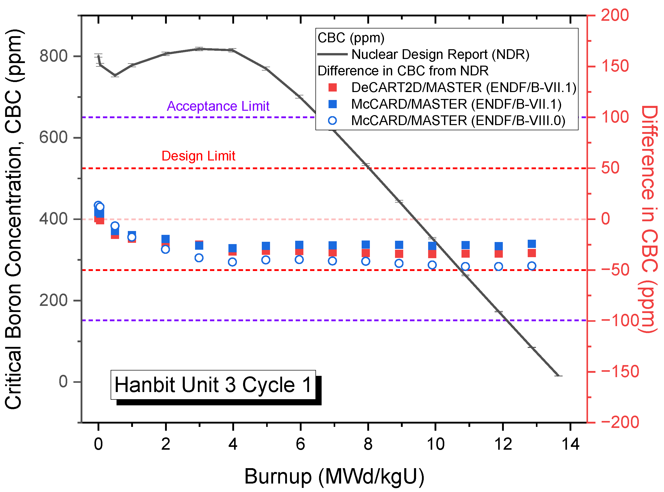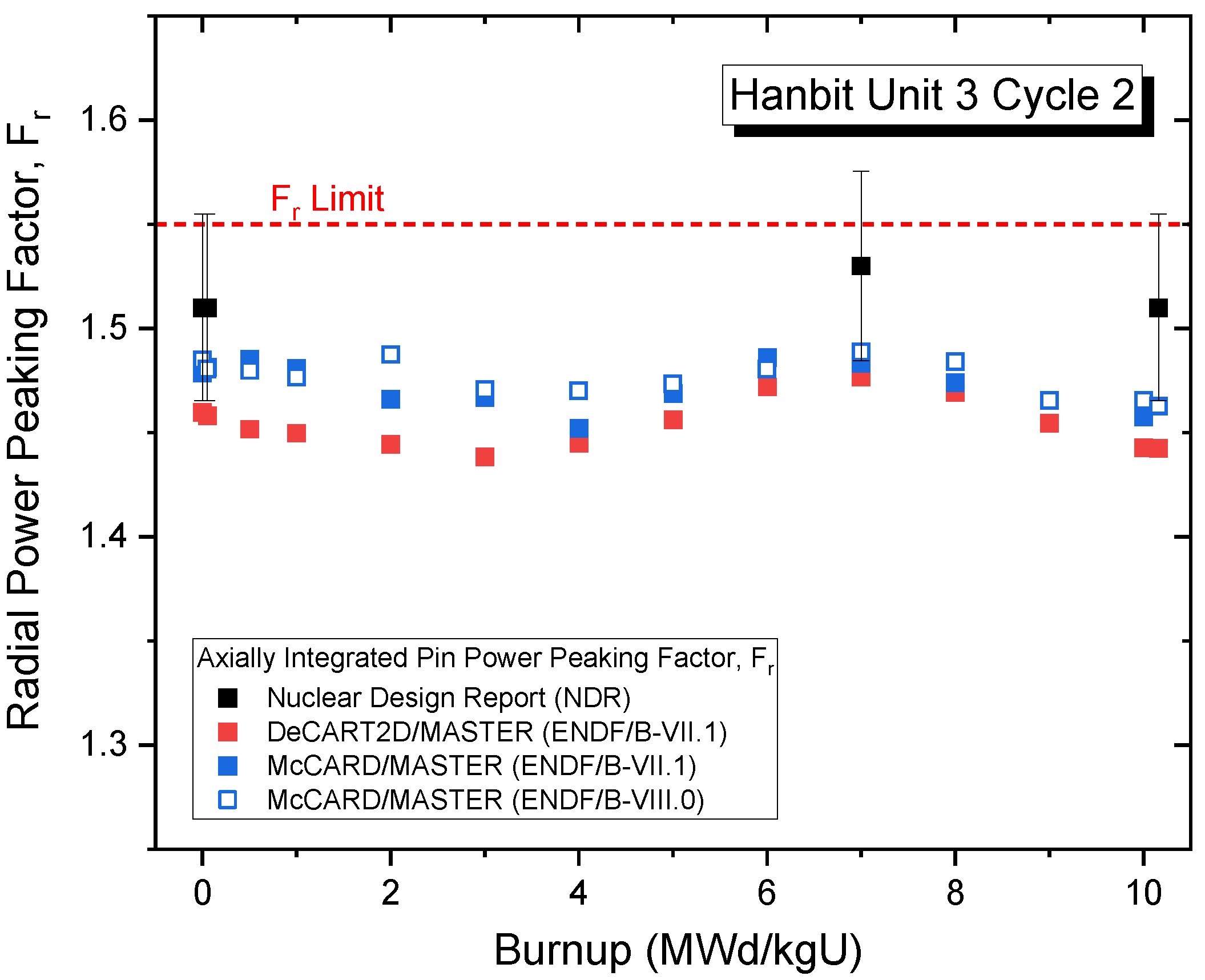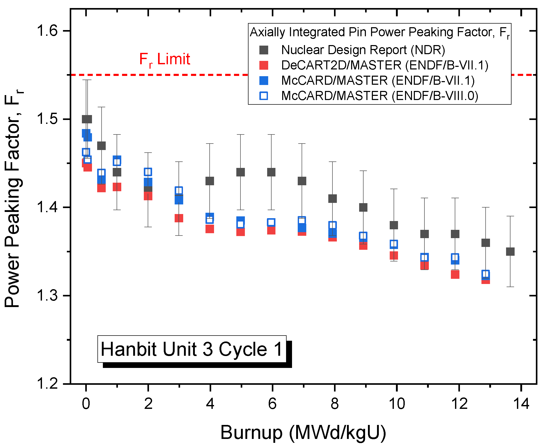 Whole-core analyses for Hanbit Unit 3 cycles 1 and 2 were conducted using the MASTER code with the FGCs and reflector cross-sections prepared by McCARD and MACAO/PROMARX, respectively. In the NDR, the uncertainties of the nuclear core design parameters were not directly provided. However, the uncertainties of the DIT/ROCS code system used for the NDR calculations were available in a document concerning another system (i.e., APR-1400) [18]. The reactivity uncertainties are within 0.26% Δρ, while the 95/95 confidence intervals for Fr and Fq are 5.93% and 4.24%, respectively. The NDR results for Hanbit Unit 3 are presented with error bars derived from the uncertainties reported in the document. The propagation of errors between McCARD and MASTER will be clarified and reported in a future study.