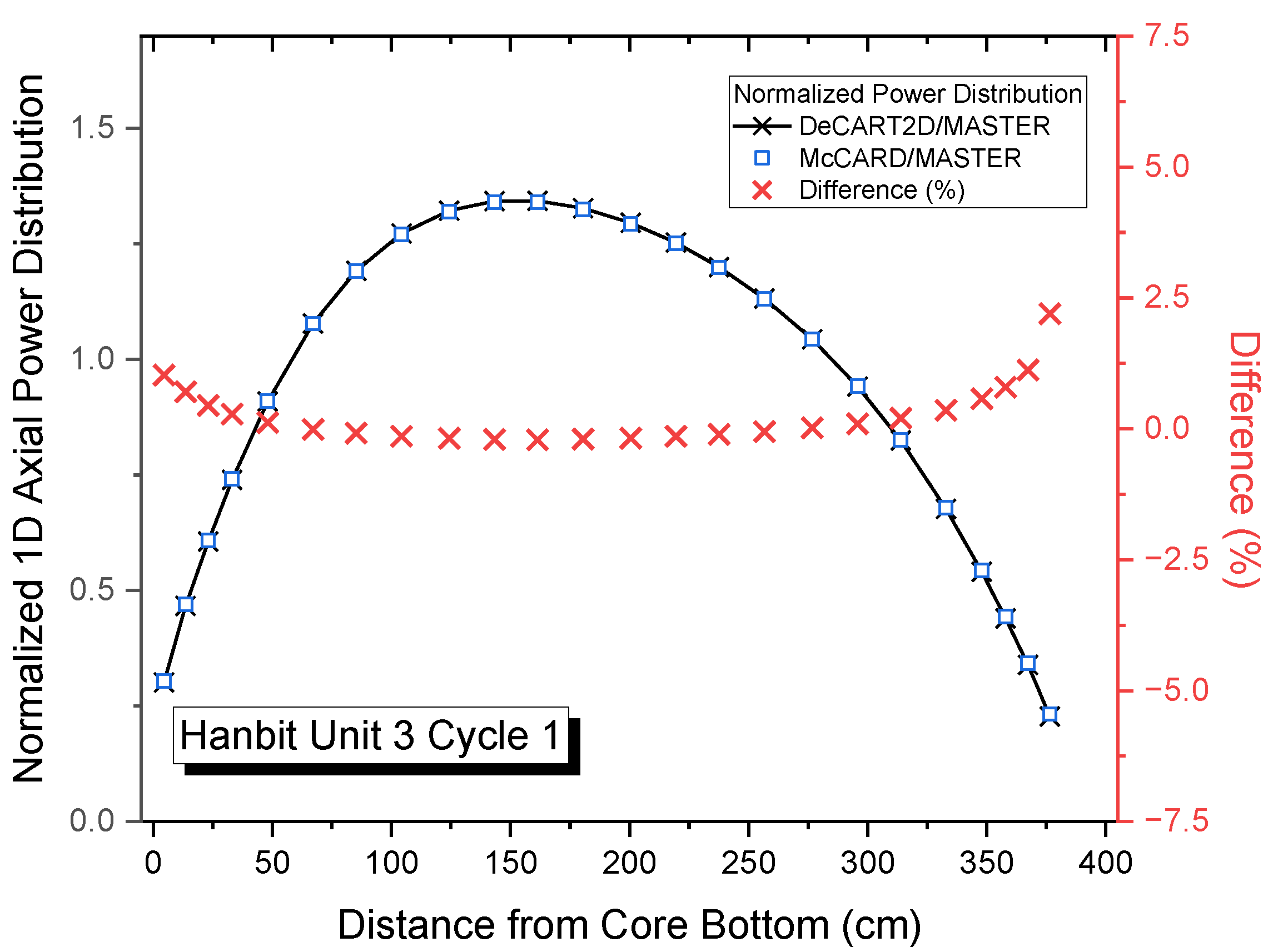 Meanwhile, at the EOC for cycle 1, the RMS differences are 1.31% for McCARD/MASTER and 1.46% for DeCART2D/MASTER. Figure 14 shows the FA-wise power distributions near the BOC for Hanbit Unit 3 cycle 2. In this case, the RMS differences at the BOC for cycle 2, based on the NDR results, are 1.16% for McCARD/MASTER and 1.08% for DeCART2D/MASTER. Figure 15 compares the 1D axial-normalized power distributions determined by McCARD/MASTER and DeCART2D/MASTER for the BOC for cycle 1. The RMS difference between the two-step code systems is about 0.25%. The results of these comparisons of FA-wise and 1D axial power distributions confirm that the new reflector cross-section generation system with the SENM-based MACAO code was properly implemented in the McCARD/MASTER code system.