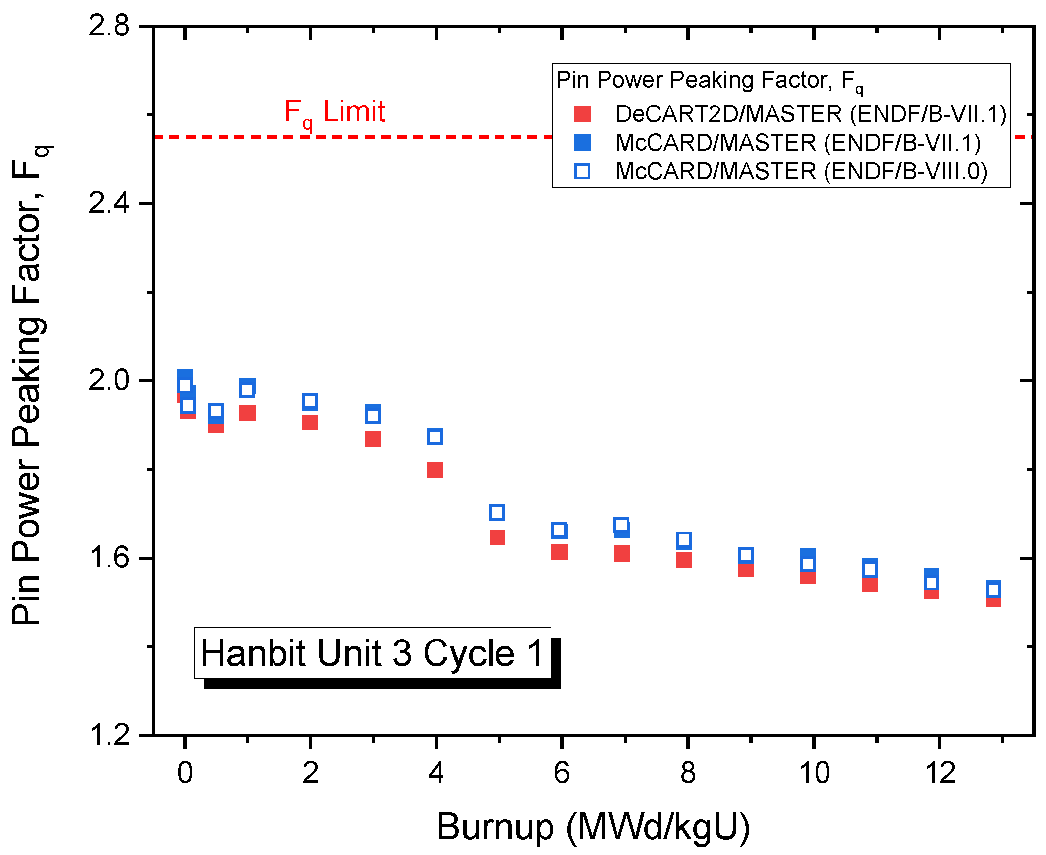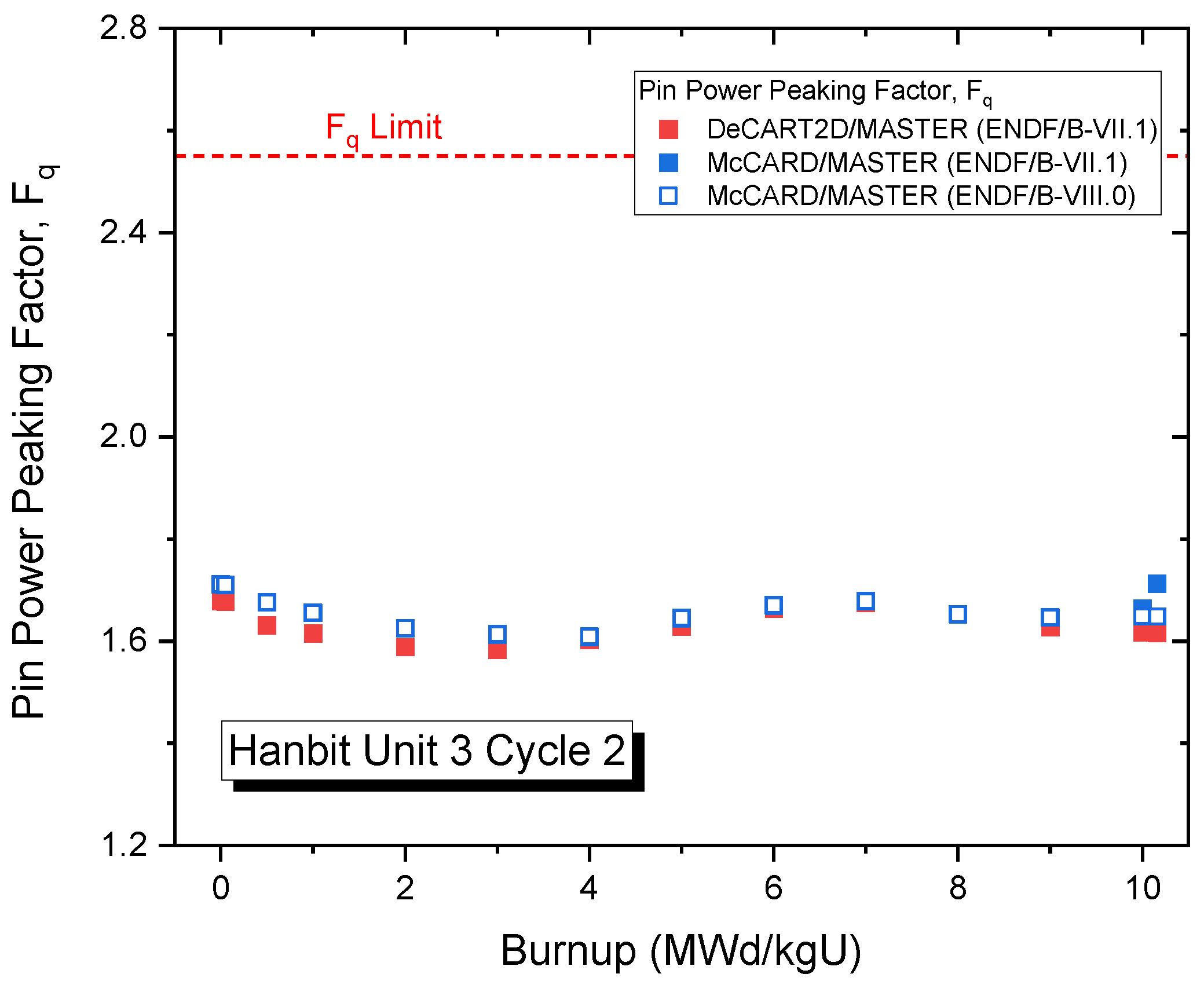 Figure 19. Comparison of the pin power peaking factor Fq values for Hanbit Unit 3 cycle 2 using ENDF/B-VII.1 and ENDF/B-VIII.0.