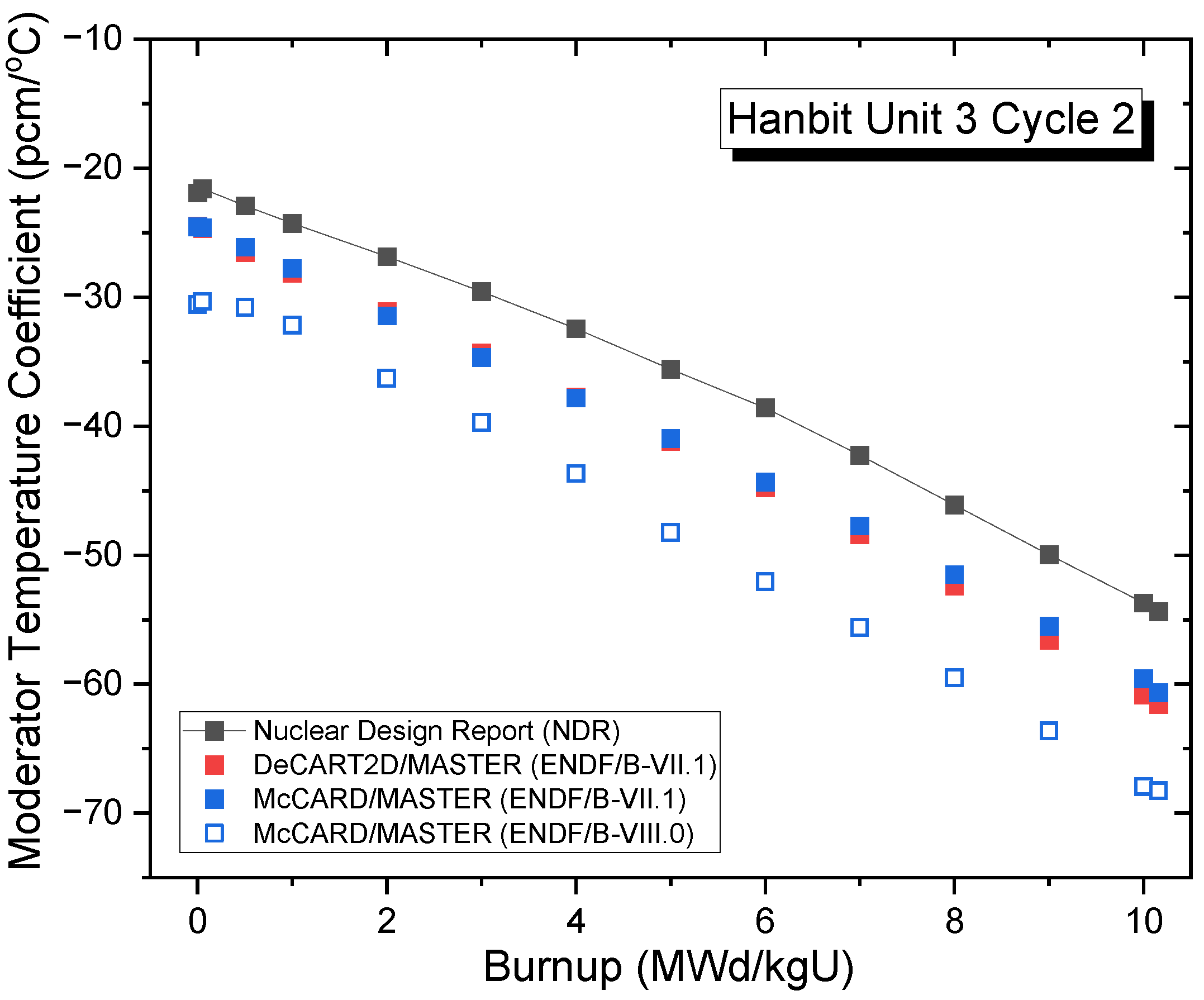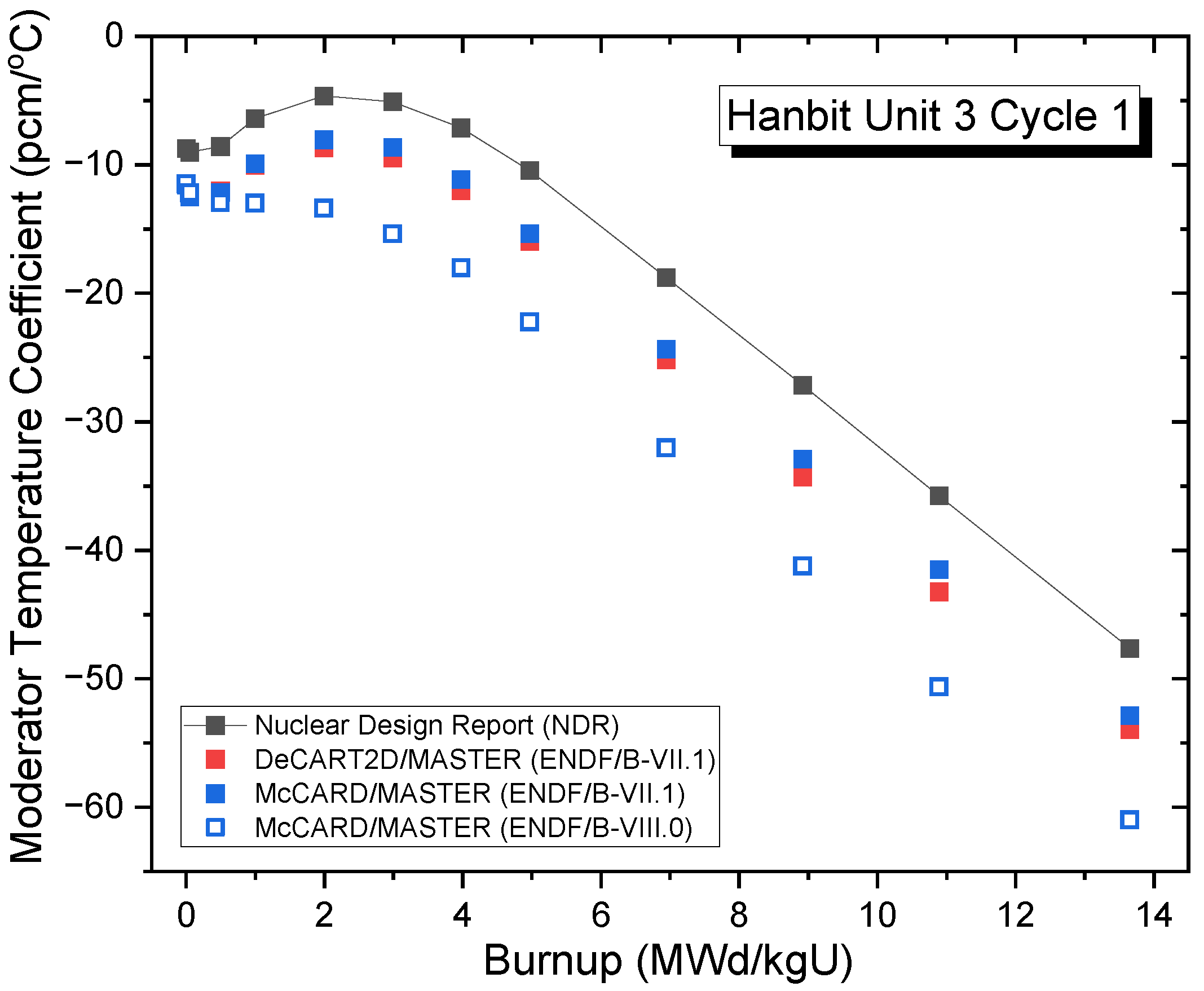 Lastly, Table 5 shows the fuel temperature coefficients (FTCs) for Hanbit Unit 3 cycles 1 and 2. The maximum difference between the McCARD/MASTER results and the NDR is 0.35 pcm/°C, while the difference from DeCART2D/MASTER is 0.18 pcm/°C. The MTC and FTC results, obtained using the same ENDF/B-VII.1 library, were in good agreement between the McCARD/MASTER and DeCART2D/MASTER analyses.