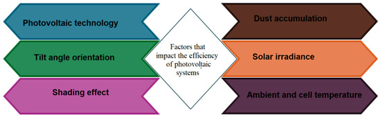 It has also been shown that climatic stresses can lead to degradation through hydrolysis, thermomechanical degradation, photodegradation, and the rate at which degradation occurs when temperature, humidity, and ultraviolet irradiation are combined [9]. The factors affecting the efficiency of photovoltaic systems are shown in Figure 1.