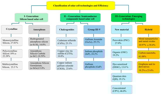 It is noted that the photovoltaic technology market is experiencing significant growth [3]; from 2010 to 2019 alone, the global installed capacity increased from 40.3 GW to 580.2 GW [4], and in 2022, the installed solar energy capacity reached 1185 GW, with photovoltaics accounting for 70% of total additions, which is around 348 GW [5]. According to experts’ projections, the world must install more than 75 TW of photovoltaic energy by 2050 to achieve its climate decarbonization targets [6]. Crystalline silicon (c-Si) photovoltaic technology has a conversion efficiency of 27.6% [7], which highlights the need for improvement in order to ensure greater competitiveness [8].