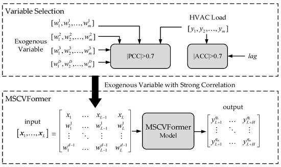 To this end, aiming at constructing a model that considers multiple factors, including the historical load data and exogenous variables, to forecast the HVAC load distribution in the future, this paper proposes the multiscale and cross-variable transformer (MSCVFormer). It employs the cross-variable attention (CVA) mechanism, capturing similar patterns between the exogenous variable and endogenous variable, thereby filtering potential patterns in the time series of the aggregated load series. To fully explore the temporality of time series, the multiscale attention (MSA) mechanism is used to handle load series with varying resolutions. Finally, the pinball loss is expanded to a multi-horizon pinball loss to achieve the prediction interval (PI) of HVAC, thereby evaluating the uncertainty of the predicted HVAC load. The main contributions of this research are as follows.