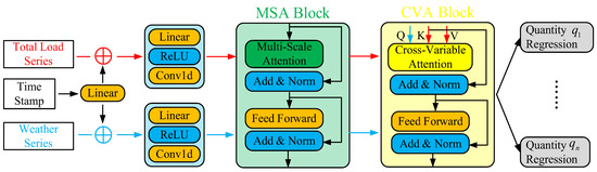Figure 2 displays the architecture of the proposed model, MSCVFormer. It can be divided into three parts, including the MSA blocks capturing the complex temporal patterns of time series from the weather variables and the aggregated load, as well as the CVA blocks exploring the temporal pattern representation of the aggregated load, which is related to the weather variables. Finally, multiple multilayer perceptions are utilized to achieve the multi-horizon quantile regression.