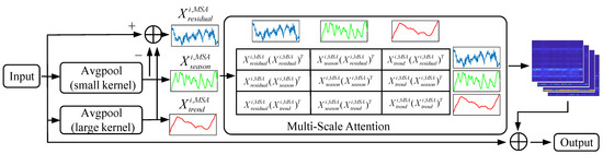 Then, the MSA mechanism is employed to explicitly calculate the pattern correlation between the sub-series, followed by picking up these critical features for the current task, which could be formulated as Equations (8) and (10). First, as shown in Equation (8), varying linear layers, including , , and , are employed on to produce different perspectives, including , , and , respectively. These linear layers are learnable, thereby enhancing the learning capacity of the model. After that, the dot product between and is calculated to obtain the attention score, assigning the large weights for these features, which are closely related to the current task. Different from the normal self-attention mechanism, the proposed MSA mechanism calculates the attention scores considering multiscale time series, explicitly exploring the correlation between the residual, seasonal, and trend components. By employing this mechanism on each component, the critical temporal pattern can be comprehensively captured, thereby enhancing the model’s learning capacity. In the end, as shown in Equation (10), the residual connection is utilized to improve the performance of the current task and avoid the performance degradation that usually appears in NNs with many layers.