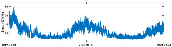 Two datasets were used to conduct the experiments, including the WPuQ dataset [40] and the EnergyDetective2020 dataset [41]. Specifically, the WPuQ dataset collected the electricity consumption of whole households and thermal appliances from some households in the same community. The collection period was from 2018 to 2020 with a 1 h time resolution. Due to the missed measurements, 21 households, whose measurements exceeded 90%, were selected for this experiment. The sum of their whole household electricity consumption was used as the aggregated load, while the sum of their thermal appliance electricity consumption was used as the HVAC load. Figure 4 shows the curve of the aggregated load. It can be observed that the energy demand in the winter season is higher than in the summer season. Apart from the aggregated load and HVAC load, the WPuQ dataset also provides the measurements of exogenous variables, including apparent temperature (AT), atmospheric pressure (AP), relative humidity (RH), solar irradiance (SI), and wind speed (WS). Through the calculation of PCC and ACC, the exogenous variables strongly related to HVAC load and the periodicity pattern of HVAC can be obtained, whose concrete values are shown in Figure 5. According to the content of Figure 5a, the AT has a strong relationship with HVAC, while other exogenous variables have a weak one. Therefore, the AT was utilized in the HVAC load forecasting. Furthermore, according to the content of Figure 5b, the HVAC load displays strong periodicity in the time scales of one day and one week. Therefore, the timestamp was utilized in the HVAC load forecasting.
